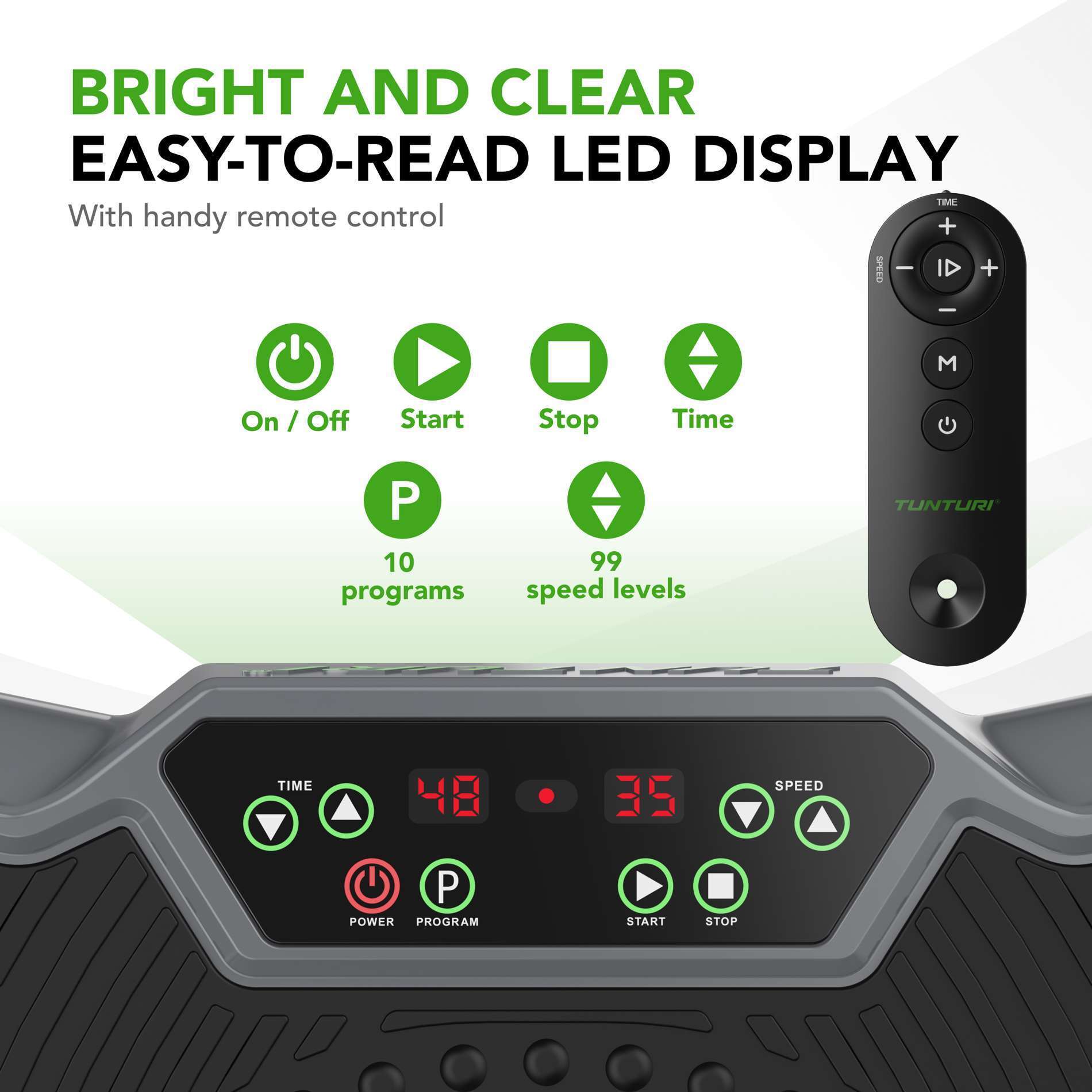 The Tunturi Cardio Fit V40 Vibration Plate offers versatile vibration training for home use. Its 99 speed levels and 10 different programs allow you to tailor your workout to your individual fitness level. Vibration activates multiple muscles simultaneously, supporting muscle maintenance, improving balance, and increasing muscle activity, for example, during desk work.