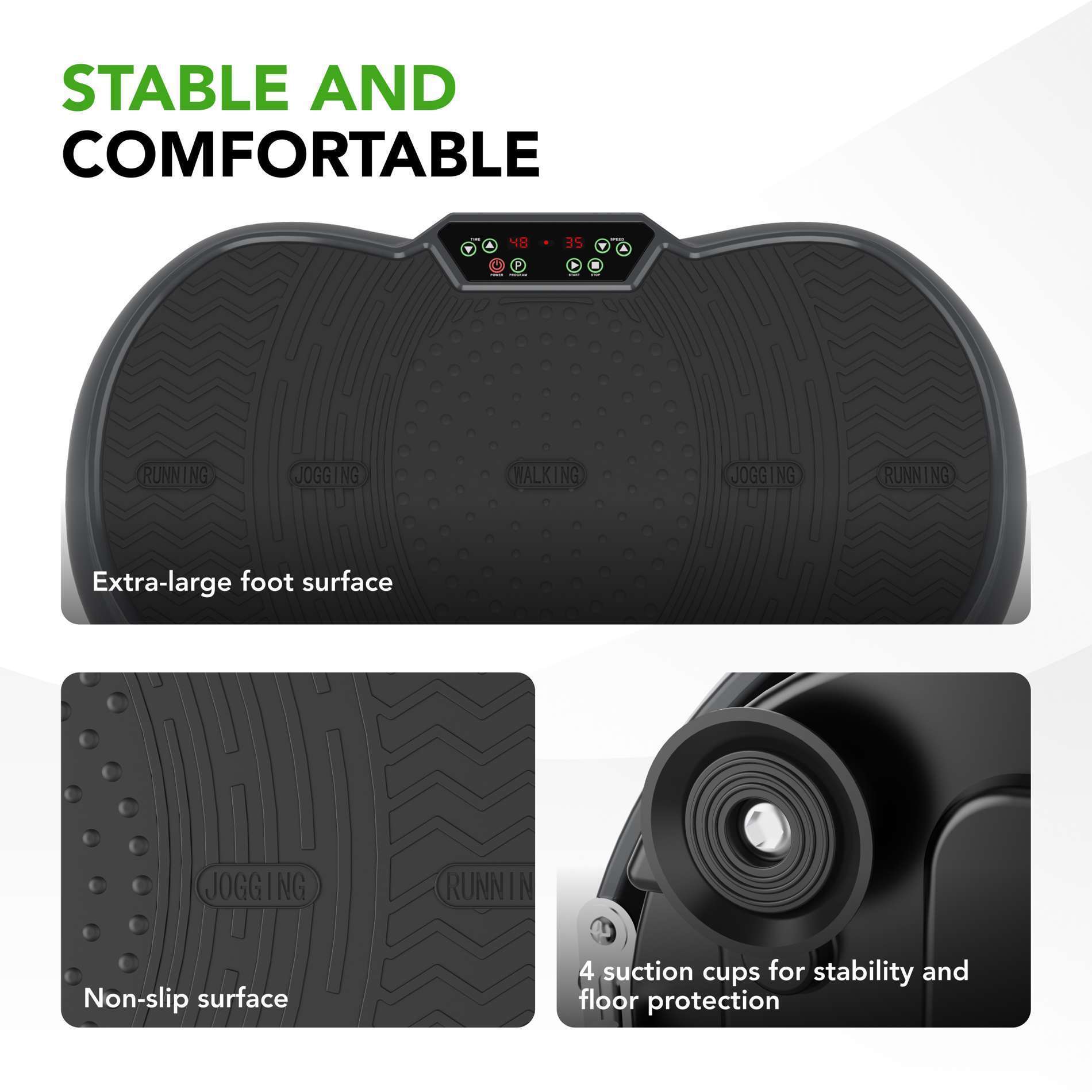 The large, non-slip surface provides a good grip, and four suction cups keep the device firmly in place even on slippery floors. The LED display shows you the workout time, speed, and selected program at a glance, making it easy to monitor your progress.