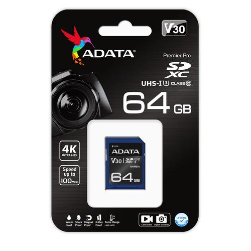 Premier Pro SDXC UHS-I U3 memory cards are equipped with a built-in write-protect switch and automatic error correcting code (ECC) functionality. They pass rigorous waterproof, shockproof, X-ray proof, anti-static, and extreme temperature testing for rugged durability. All cards feature high quality MLC Flash, ensuring longevity and reliability.ADATA ASDX64GUI3V30S-R. Capacity: 64 GB, Flash card type: SDXC, Flash memory class: Class 10, Internal memory type: UHS-I, Read speed: 100 MB/s, Write speed: 60 MB/s, UHS Speed Class: Class 3 (U3), Video Speed Class: V30. Product colour: Black, Blue