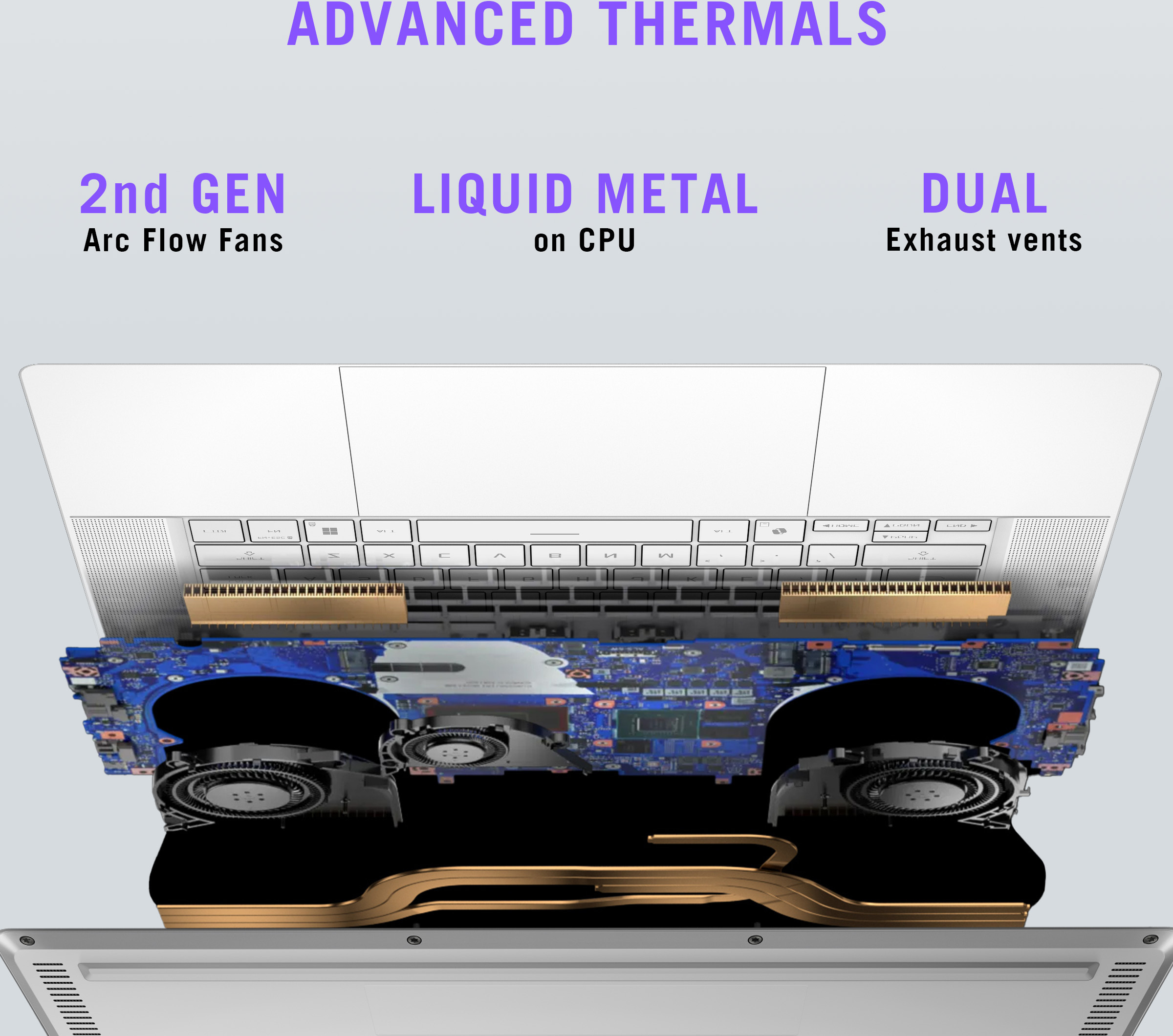The laptop is powered by an NVIDIA GeForce RTX 5070 graphics card with 8GB of GDDR6 memory. This device can easily handle the latest AAA games and creative applications. The cooling system features 2nd generation Arc Flow fans and liquid metal to keep the hardware cool and quiet even under stress.