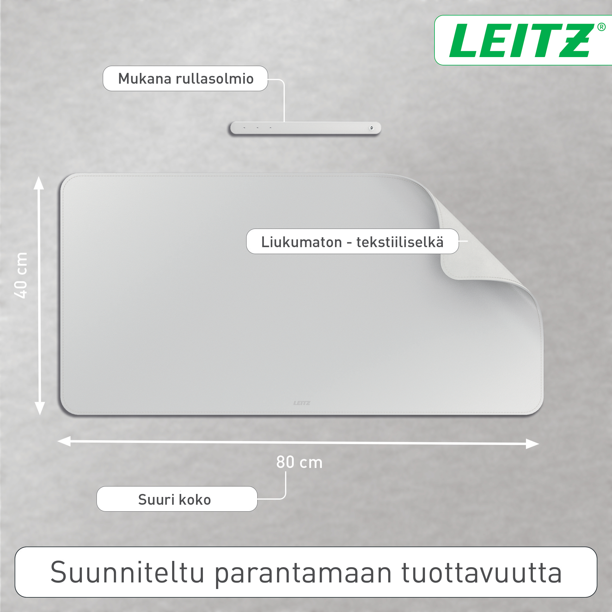 Pysy tuottavana ja tunne olosi hyvinvoivaksi mihin tahansa työpäiväsi viekin sinut Leitz-pöytämaton kanssa. Se on helposti puhdistettava, vedenpitävä iso hiirimatto, joka pitää työpöytäsi siistinä. Sen suuri 80 x 40 kokoinen pinta tarjoaa tilaa näppäimistölle, hiirelle, vihkolle ja tarvikkeille ja suojaa työpöytääsi naarmuilta, tahroilta, roiskeilta ja hankauksilta. Yhteensopiva kaikkien laser- ja optisten hiirten seurannan kanssa.