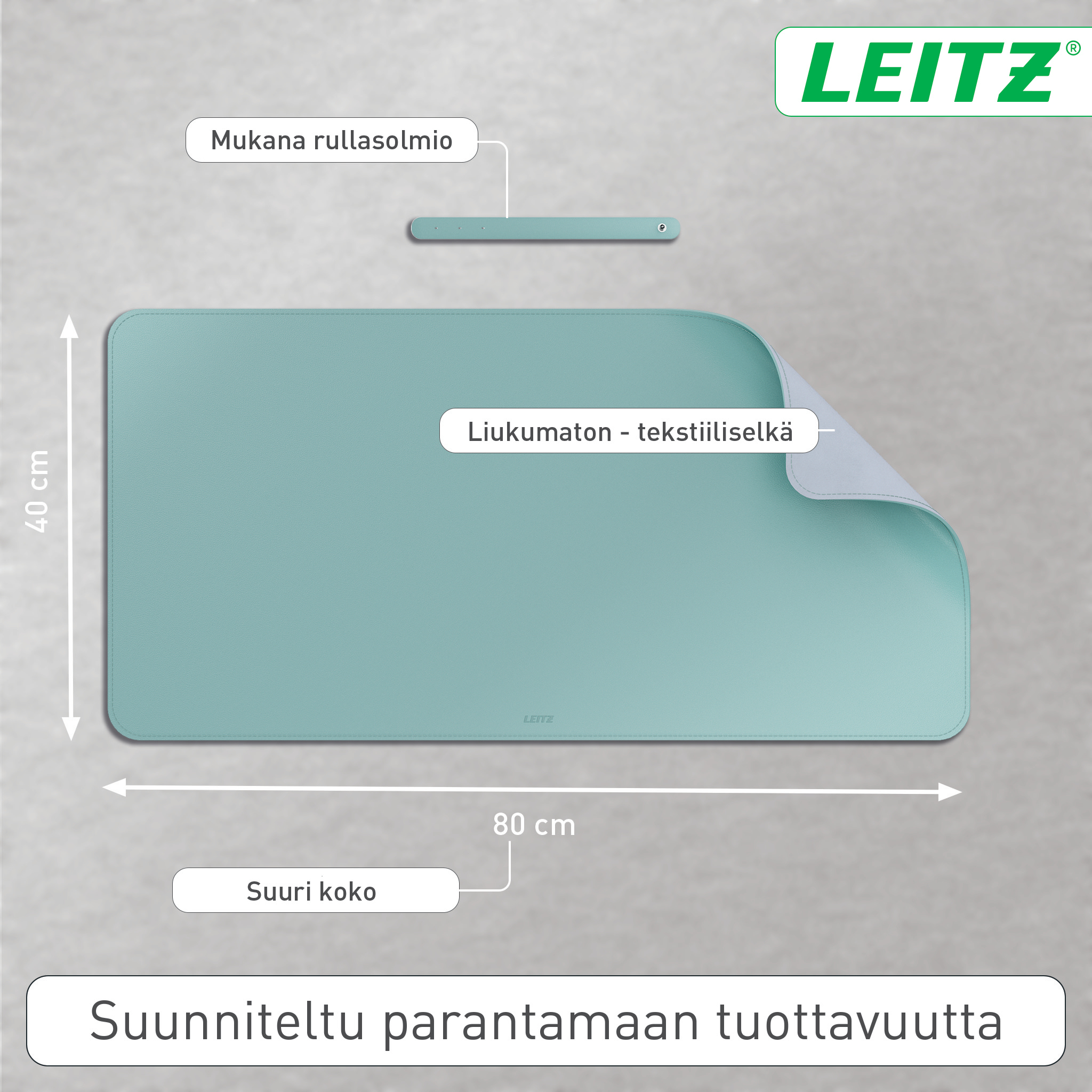 Pysy tuottavana ja tunne olosi hyvinvoivaksi mihin tahansa työpäiväsi viekin sinut Leitz-pöytämaton kanssa. Se on helposti puhdistettava, vedenpitävä iso hiirimatto, joka pitää työpöytäsi siistinä. Sen suuri 80 x 40 kokoinen pinta tarjoaa tilaa näppäimistölle, hiirelle, vihkolle ja tarvikkeille ja suojaa työpöytääsi naarmuilta, tahroilta, roiskeilta ja hankauksilta. Yhteensopiva kaikkien laser- ja optisten hiirten seurannan kanssa.
