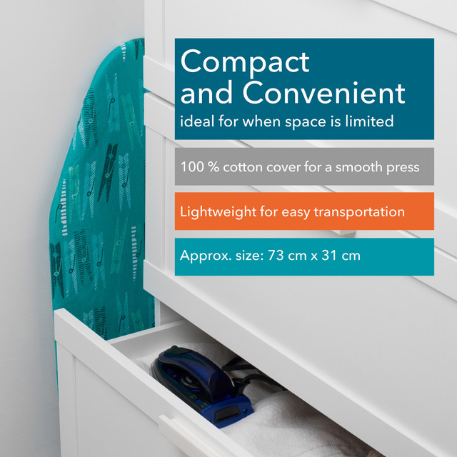 Features A table top ironing board is perfect if you struggle to stand for long periods of time, or simply if you prefer to iron sitting down. The lightweight portable board is great for travel as it folds up neatly and has felt pads to protect the surface you have it sat on. Measuring just 73 x 31 cm with a height of 15 cm, the ironing board is easy to store away at home, with the legs folding up underneath. With a brightly coloured wash day cover, the cheerful board is delightfully easy to put up and take down, great for a last minute use. The soft 100% cotton cover and dynamic rounded shape will support your clothes while you iron for beautiful results every time.