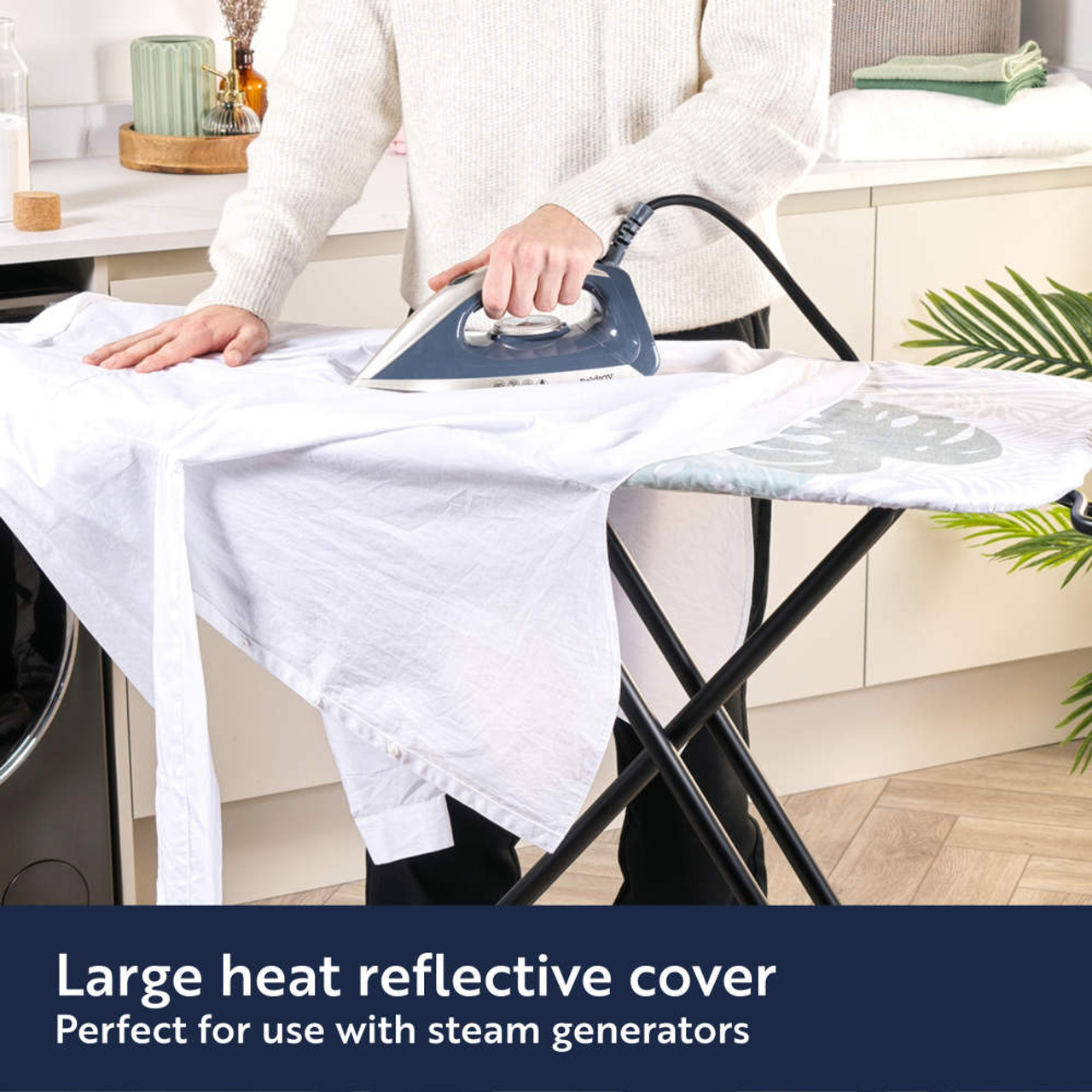This Beldray Supreme Comfort ironing board has a wider surface for bigger ironing jobs, measuring 122 x 45 cm. A larger heat reflective surface area and a thick felt underlay ensures more effective crease removal, ideal for using lots of steam. With an adjustable iron rest for any shaped irons, and 7 variable height options so you can choose the most comfortable setting for you. This family-sized ironing board is ideal for larger families and households with lots of laundry, as well as pressing bedding and bigger items. The palm-print design cover adds a bright, cheerful element to your ironing and is machine washable at 30° C for easy maintenance. Dimensions (cm) 94 x 45 x 122 Color Green (Palm Print)