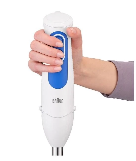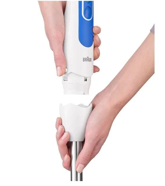The MultiQuick 3 series hand blender is designed for making sauces, soups, smoothies, creams, and baby food.Functionality: PowerBell Plus: extra blade with a unique shape for more efficient chopping and blending. Two-speed control: easy switch between low and high speed for different ingredients. EasyClick: quick and safe attachment changes (chopper, whisk, measuring cup). SplashControl: prevents splashing, keeping cooking clean. Compatible with WaveCut attachments, ensuring even chopping of hard ingredients. Ergonomic handle with soft-touch coating for comfortable grip. One-hand operation thanks to balanced design. Easy to clean; attachments are dishwasher safe. Specifications: Power: 700 W Speeds: 2 Blade material: stainless steel Measuring cup capacity: 600 ml Chopper capacity: 500 ml Attachment system: EasyClick Splash protection technology: SplashControl Color: white with blue accents Weight: 1.2 kg Gross weight: 1.6 kg Package dimensions: Length 0.35 m × Width 0.12 m × Height 0.10 m