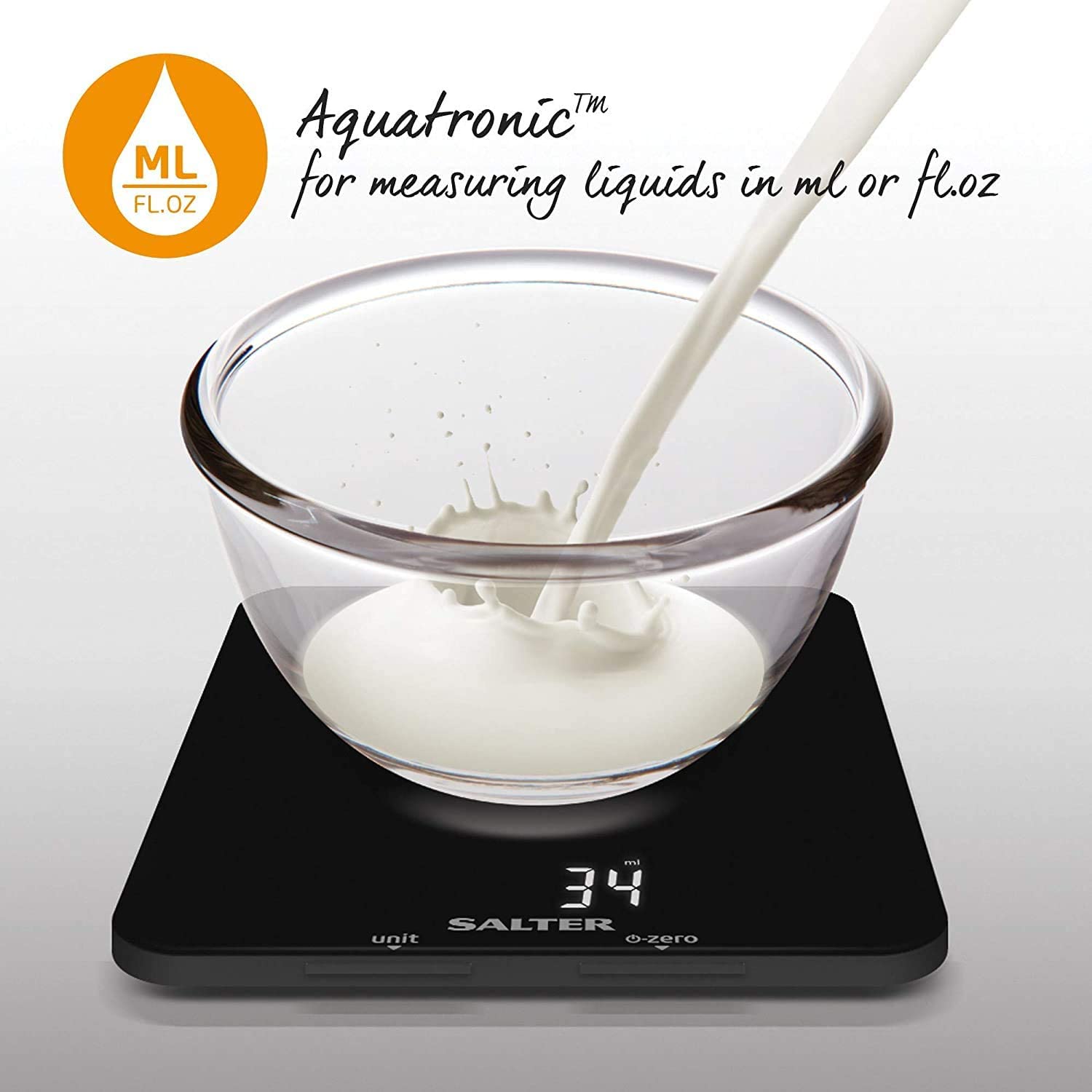 Toughened glass platform Hidden till lit white LED display Large ultra slim glass platform - hygienic and easy to clean Aquatronic function - for measuring liquids in ml or fl.oz Add & Weigh ‘zero’ function –allows for measurement of multiple ingredients in the same bowl Weigh directly on the platform or weigh with own mixing bowl –suitable for use with most bowls or containers Slim design for neat storage Max weight up to 5kg Batteries Included: 3 x AAA Batteries (Included) Product size 16.5 x 19 x 1.6 cm Weight : 0.48 kg