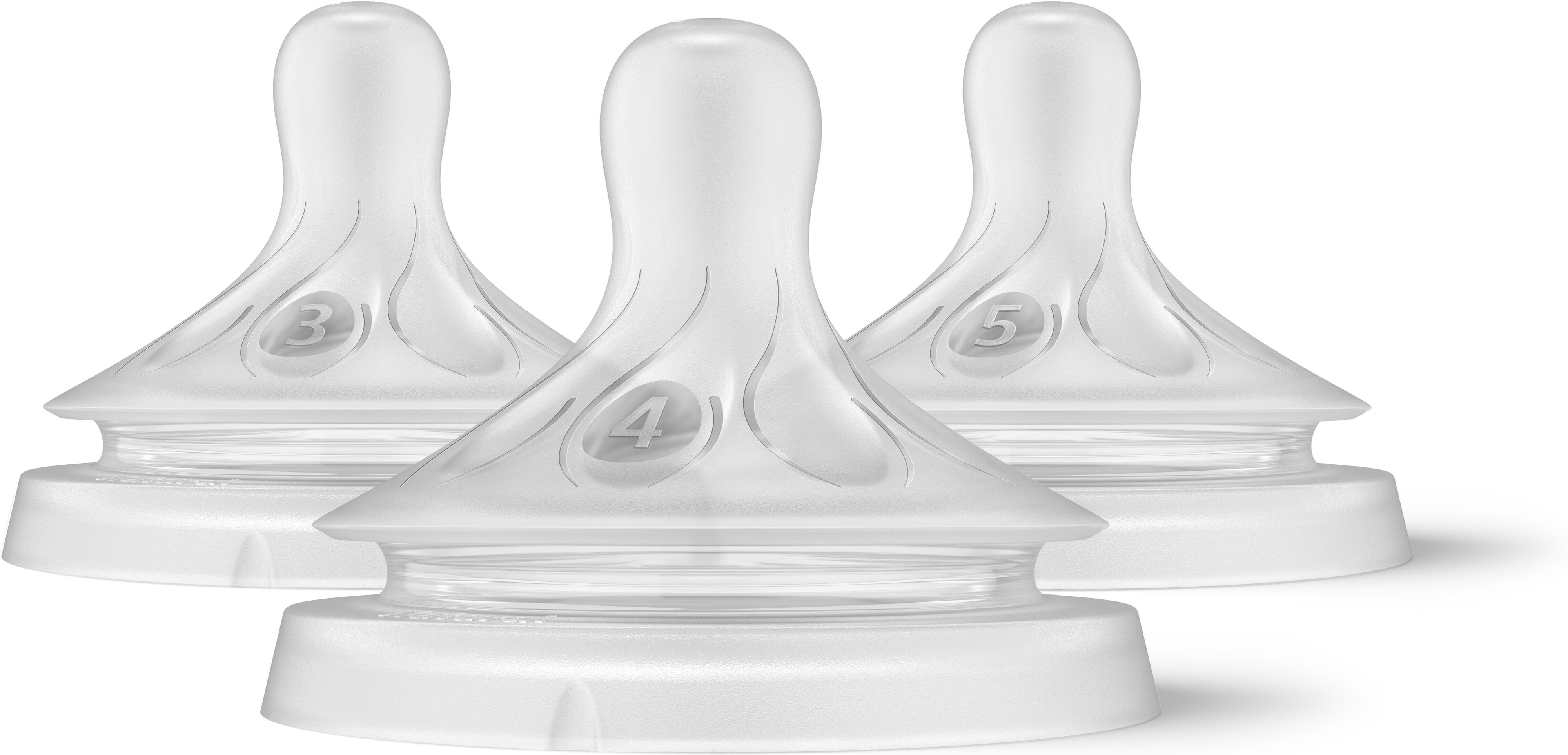 Each baby feeds in his or her own way and develops at his or her own pace. If your baby is consistently getting too little milk or has difficulty getting milk, try a higher flow rate. If your baby has a leaky mouth or swallows frequently, a lower flow rate may be more suitable. The three different options in the pack give you the flexibility to find the perfect rhythm.
