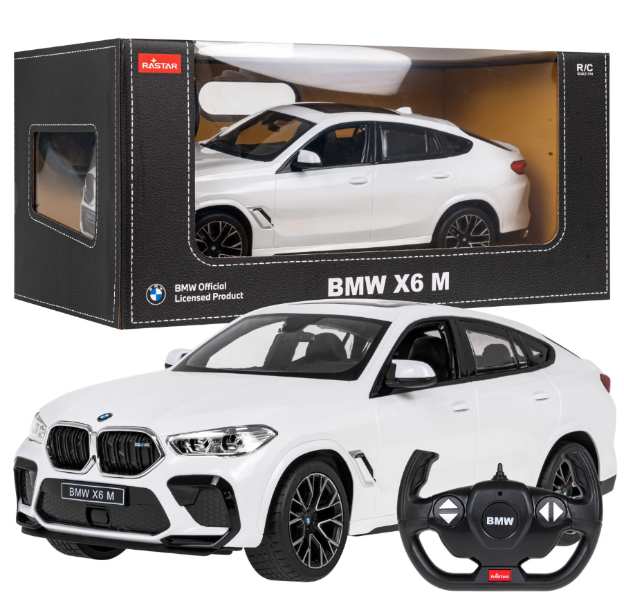 BMW X6 M 1:14 RASTAR Specification Remote controlled model of the renowned brand RASTAR, made with the utmost attention to detail.The vehicle is made of high quality ABS plastic and the highest quality mechanical and electronic components.The car is a faithful representation of real vehicle models. Rastar cars move quickly and extremely precisely. Scale 1/14 Frequency R/C 2.4GHz Detal -driving in all directions (front-back-left-right), -rubber wheels, -LED lights (front, back), -independent shock absorbers, -direction adjustment mechanismac Certyficate CE/EN71/RoHs, Power Pilot 2xAA (not included) Car 5xAA (not included) Dimension Car 35 cm x 14 cm x 13 cm Package 41x23x19 cm Kit equipment Car, Remote Control, Manual, Colored Packaging