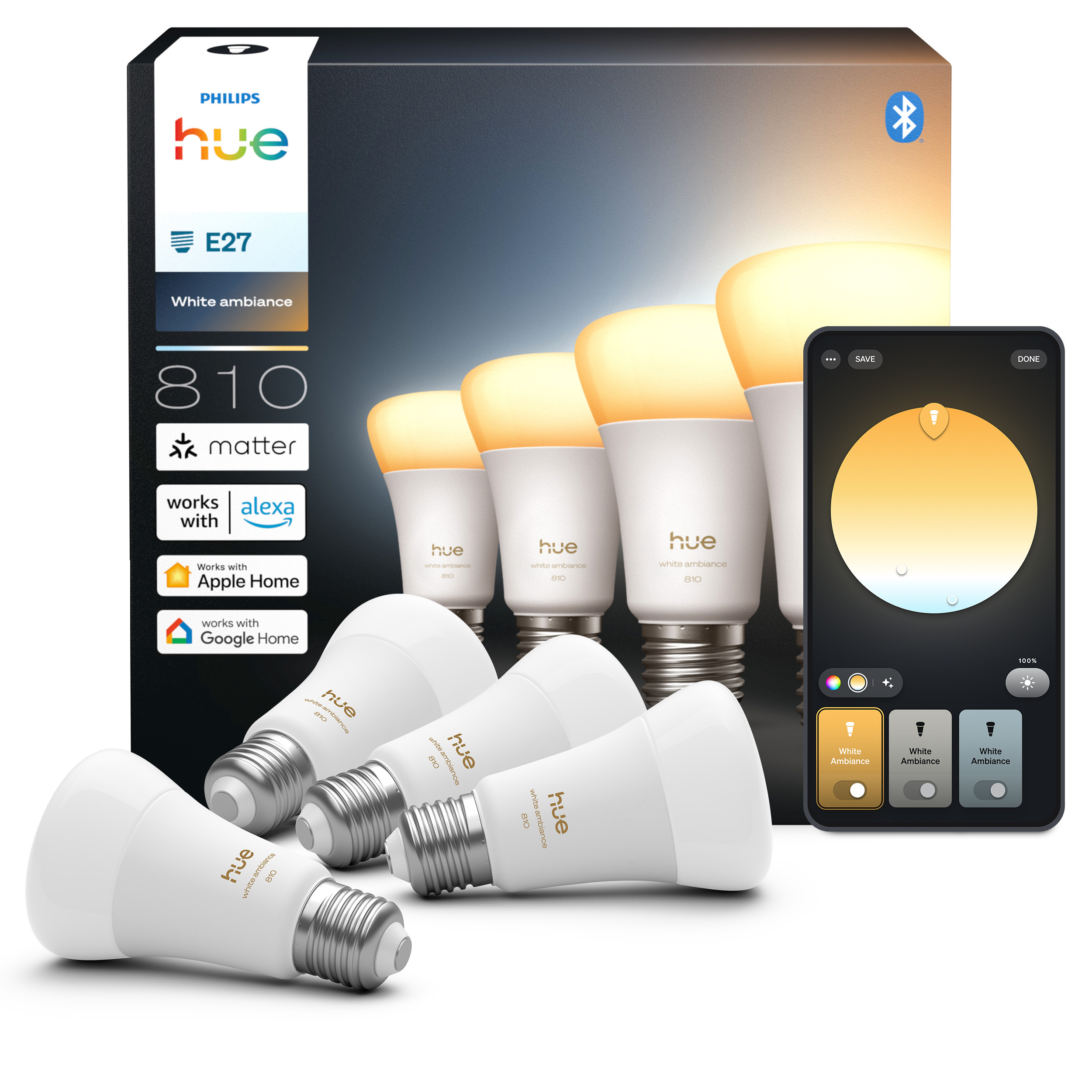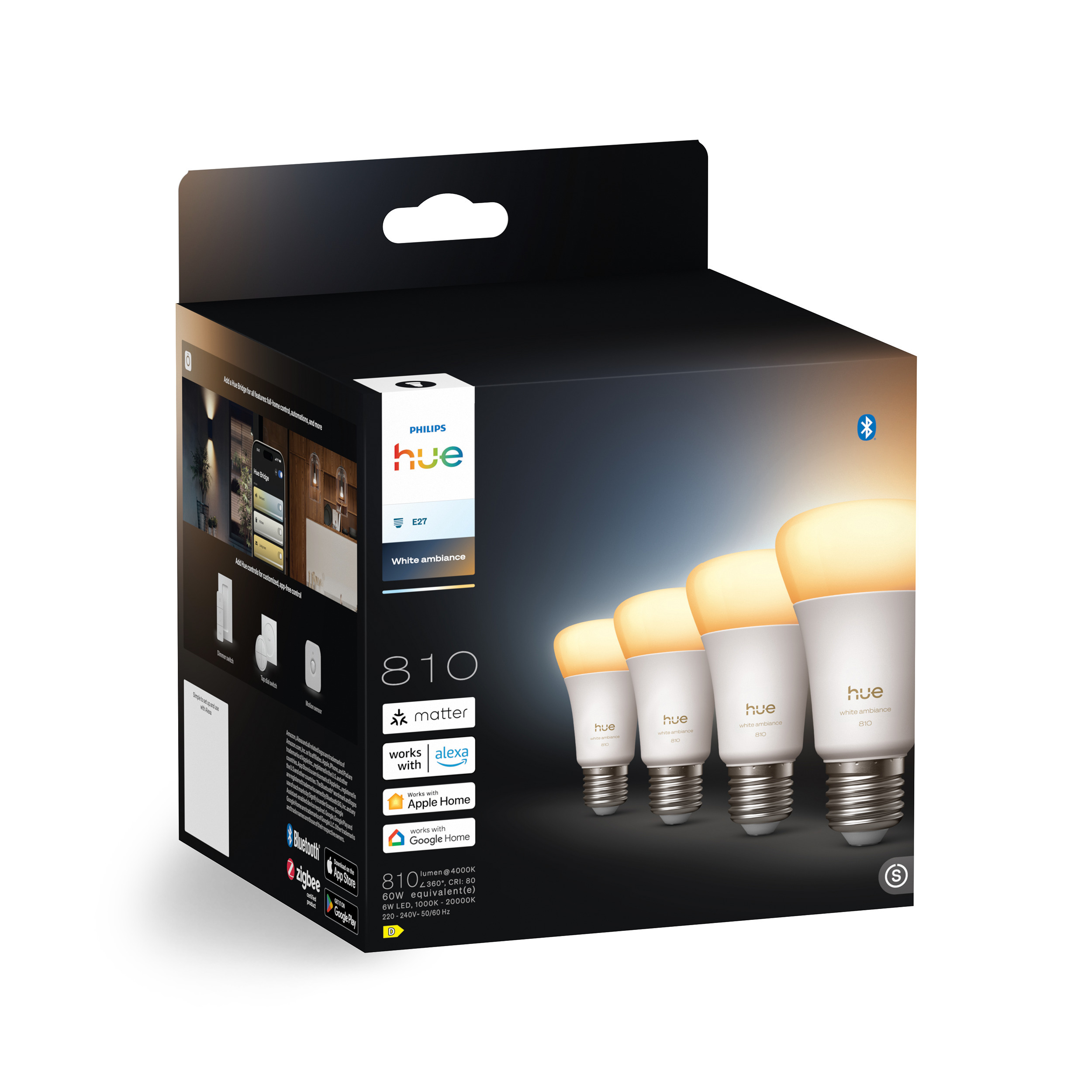 This pack contains 4 Philips Hue White ambiance A60 smart bulbs with an E27 base. Philips Hue White ambiance products feature integrated dimming, and the shade of white light can be adjusted from warm to cool. Shade and brightness can be easily adjusted via the Hue app, smart accessories, or home virtual assistants. The maximum light output is 810 lumens, and it can be dimmed down to as little as 0.2% brightness, allowing you to set the light to suit your needs.