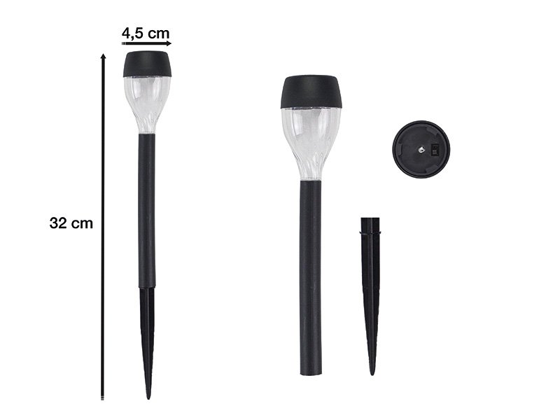 Set of 5 solar lights ideal as path and garden markers. The lamps switch on automatically in darkness and switch off in daylight, thanks to the energy coming from the sunlight. Stakes allow the lamps to be fixed to the ground anywhere in the garden, next to flower beds or along pathways. Body made of PP plastic, solar panel 2x2 cm glass. Recharge time: 4-6 hours. Autonomy: 6-8 hours. Ni-Mh battery 1x40 mAh. Width diameter 4.5 cm. Total height with spike: 32 cm. IP44 protection Product type Set of 5 solar garden/path lights Material Plastic, Glass Number of bulbs 5 Bulbs included Yes Mounting type Ground spike Sensor type Daylight sensor Type of power supply Ni-MH battery 1 x 40 mAh rechargeable IP class IP44 Dimensions (cm) 4.5 x 32 Color Black