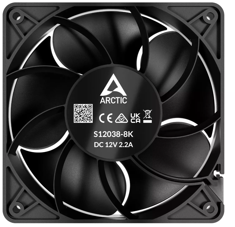 ARCTIC S12038 - 4K-3 Pack. Type: cooling system, Fan diameter: 12 cm, Rotation speed (min): 600 RPM, Rotation speed (max): 4000 RPM, Air flow: 180 m3 / h, Maximum air pressure: 11.45 millimeter of water column, Bearing type: double ball bearing. Width: 120mm, Depth: 120 mm, Height: 38 mm. Product Color: Black