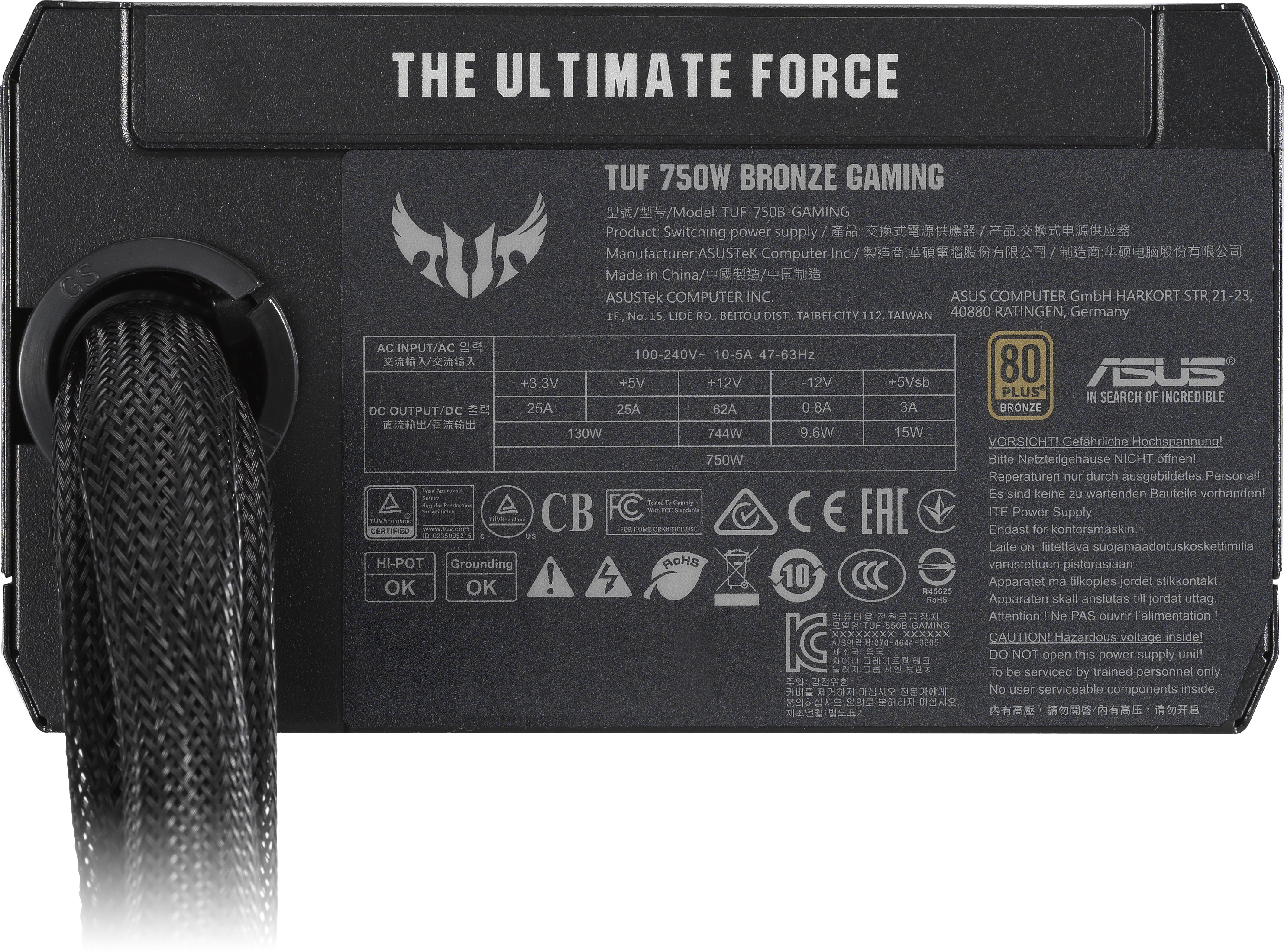 ASUS TUF Gaming 750W Bronze power supply provides 750W total power, which is sufficient for the power supply of even the most demanding components. It supports a wide AC input voltage of 100–240 V, so the power supply can be used in many different countries without the need for separate conversion.
