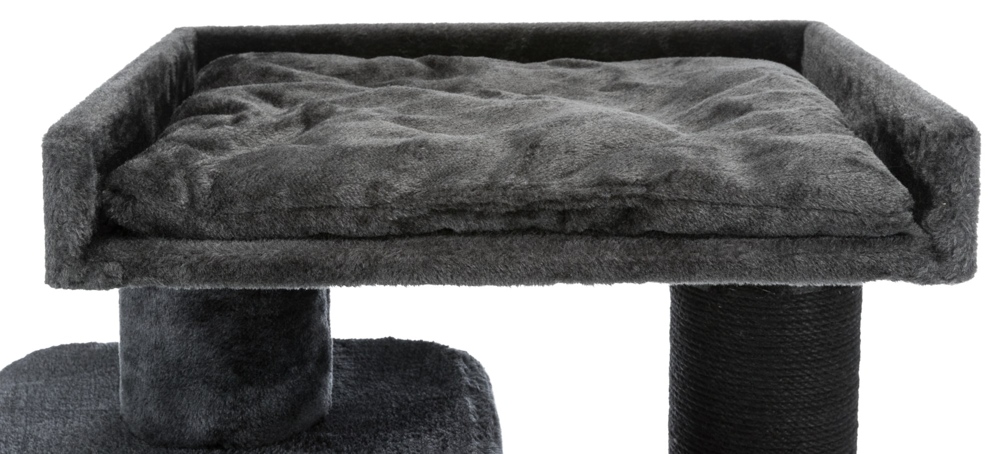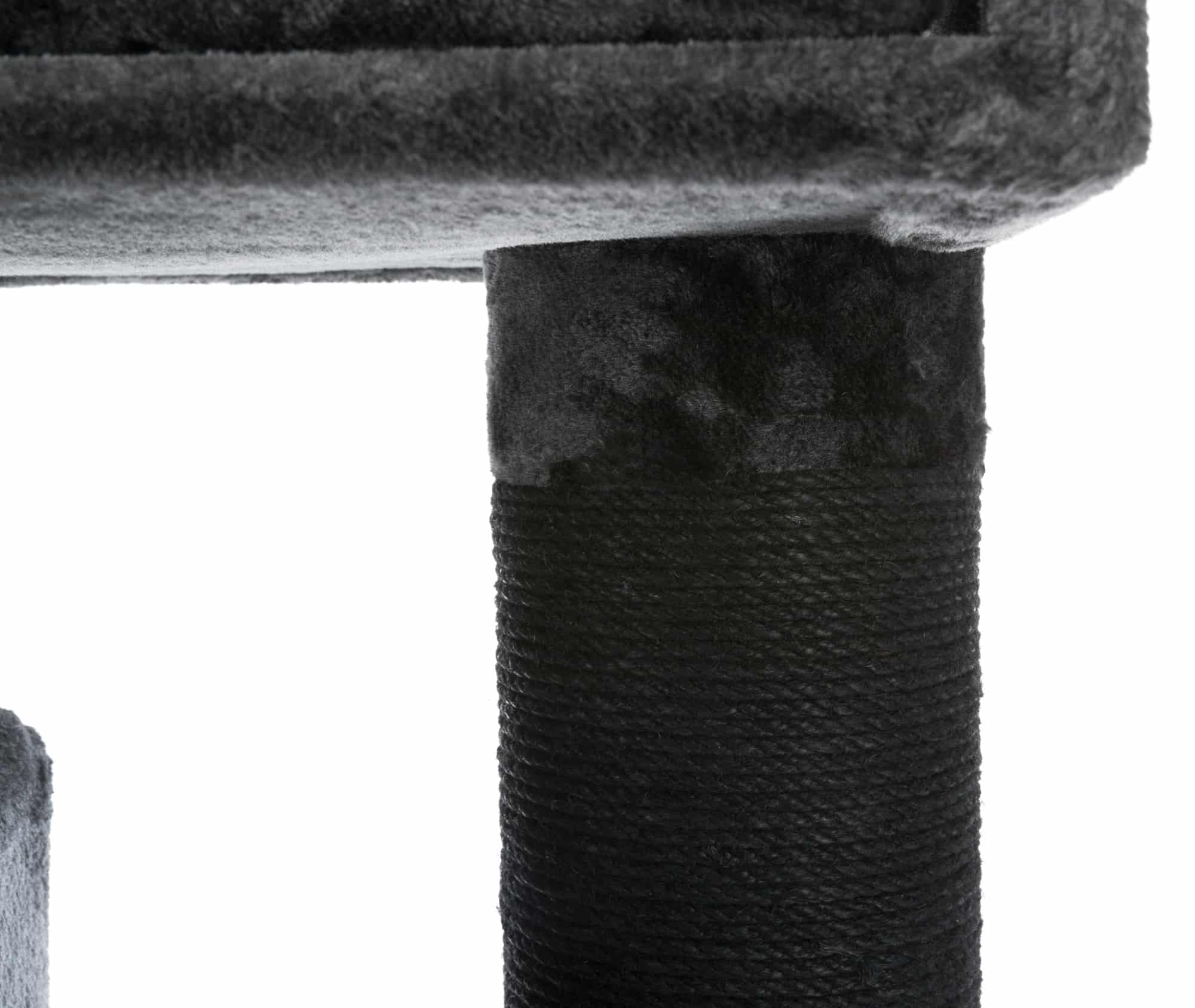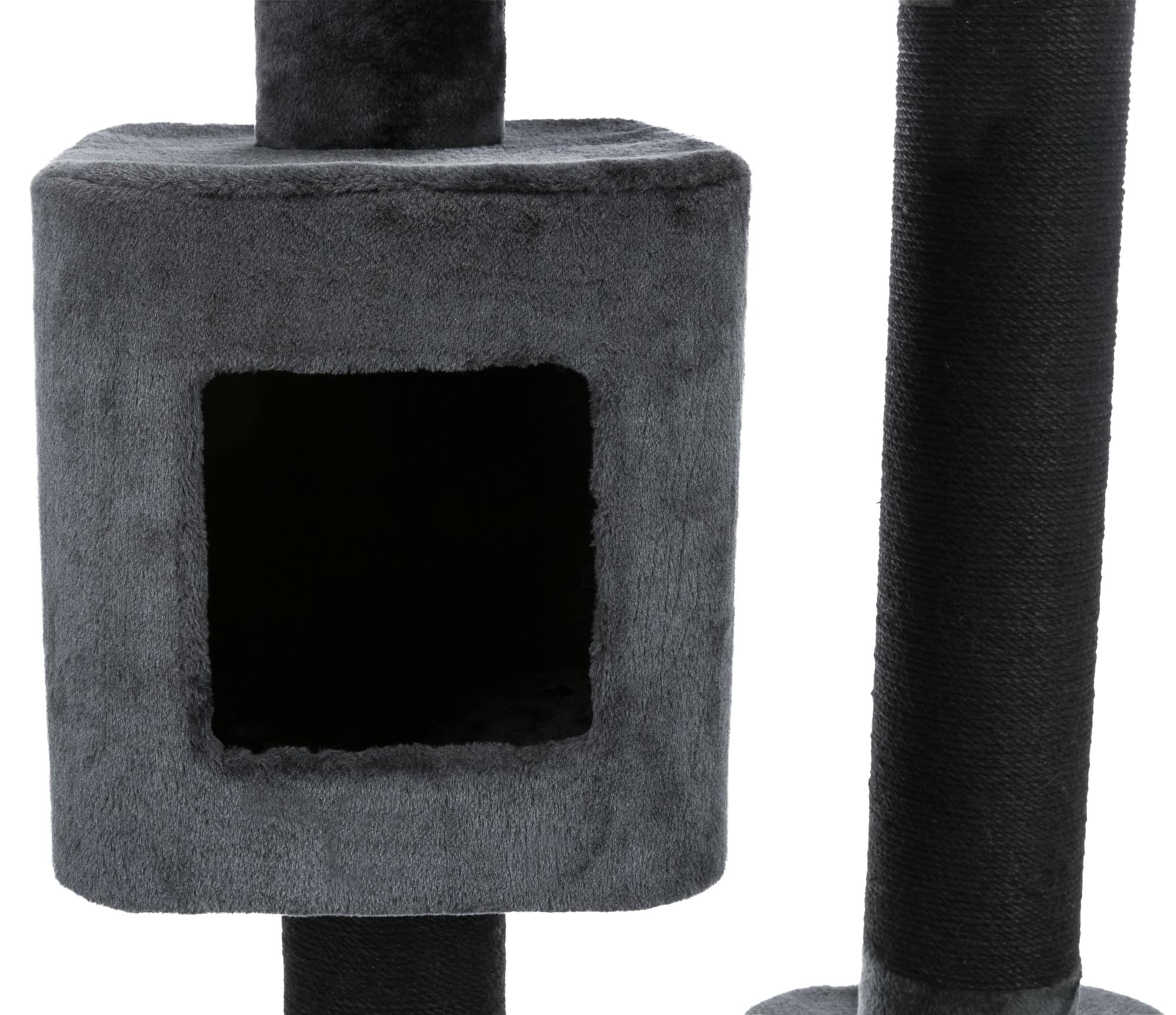 Cat house - Izan Scratching Post XXL. Ideal choice for large cats. The top is covered with a plush fabric that feels good to the touch, while the wide claw sharpening posts are covered with sisal rope. The house is easy to care for. Removable cushion is hand washable. Base dimensions: 70 × 50 cm. Post: ø 15 cm. Height: 122 cm. Colour: anthracite.