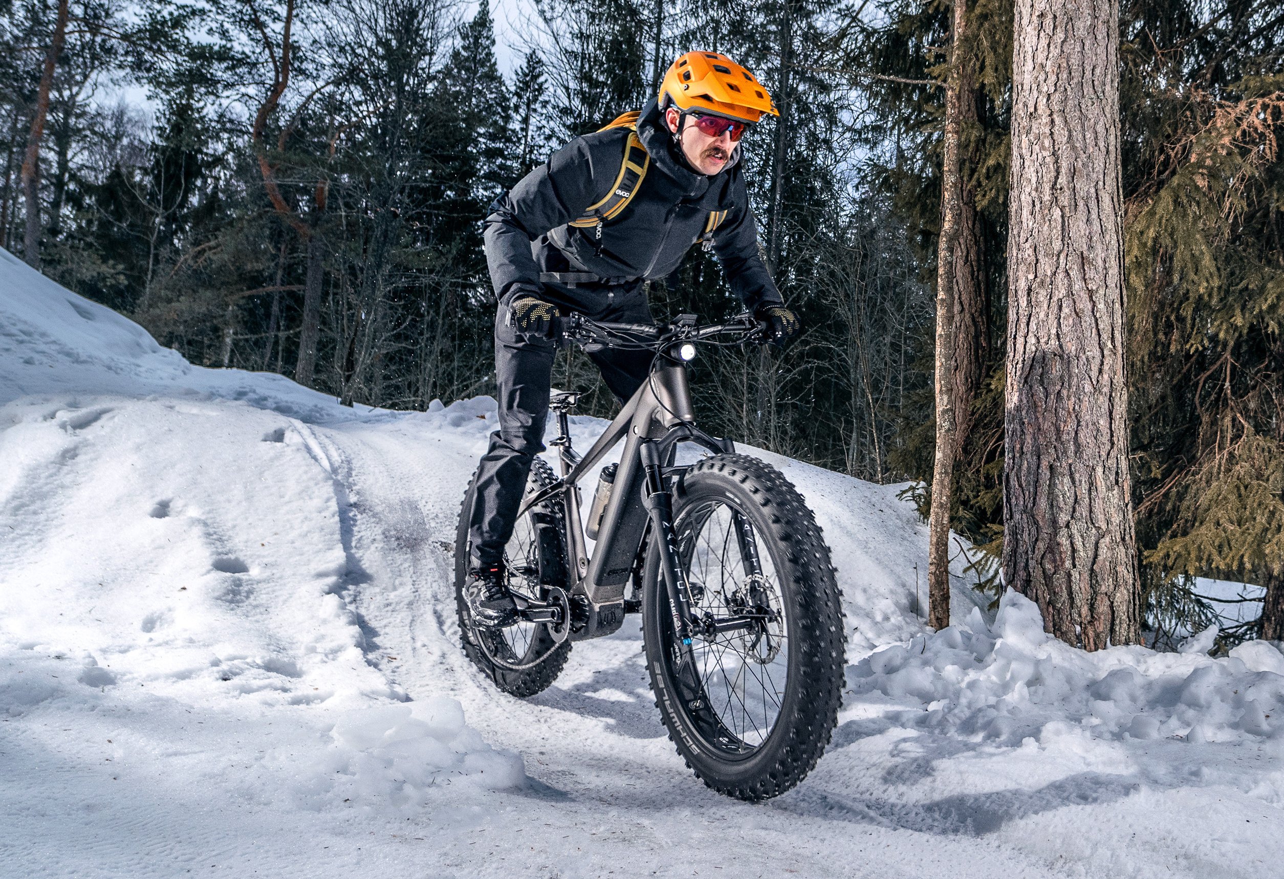 The transmission relies on the XT's reliable solutions, with gears to match the electric bike. The Manitou Mastodon Comp fork dampens bumps and smooths out the ride on uneven surfaces. Powerful four-piston hydraulic disc brakes grip the 203 mm discs effectively and stop you safely, even on a fast ride. The durable Veetire Snow Avalanche tyres and Sunringlé Mulefut wheels offer tubeless capability for those who want it.