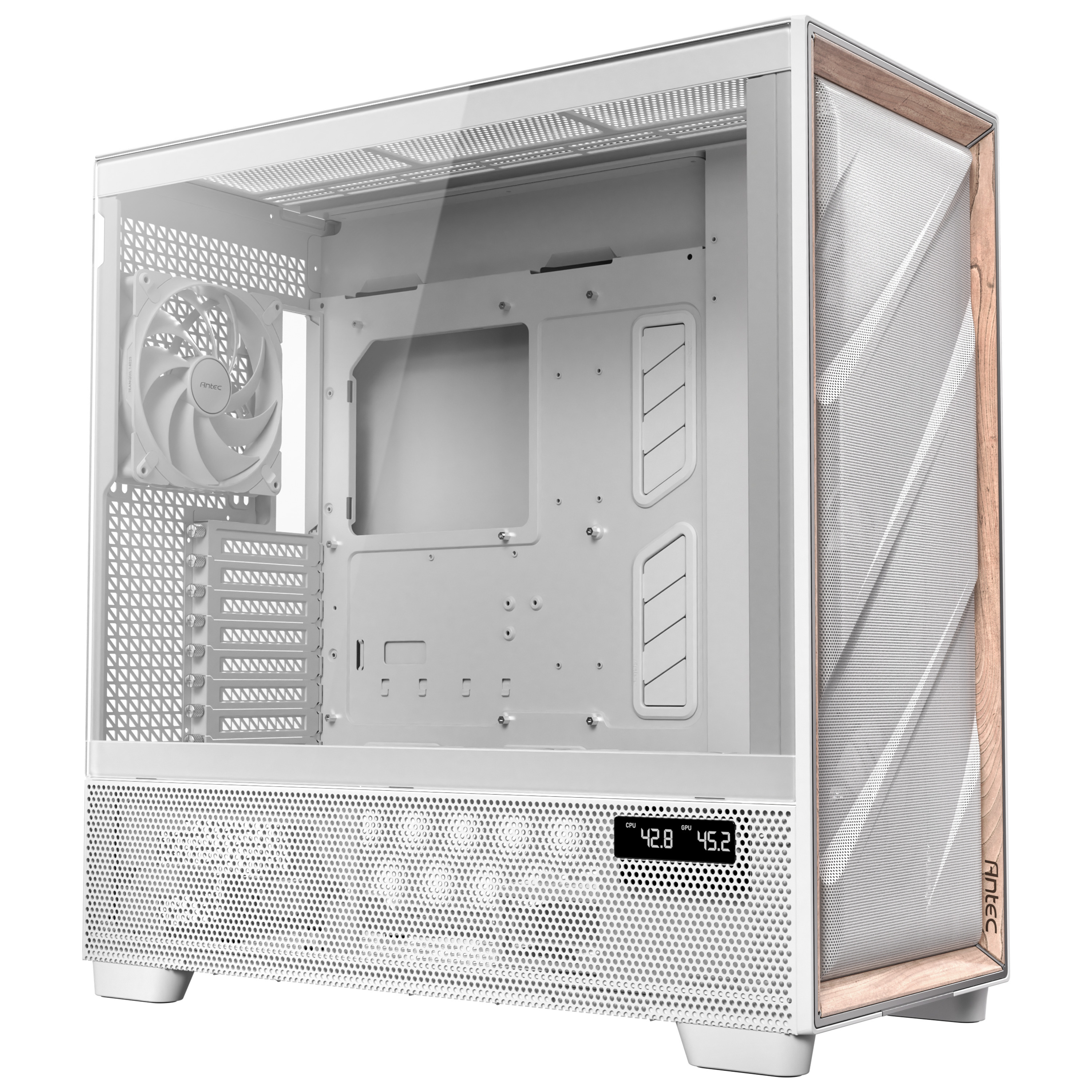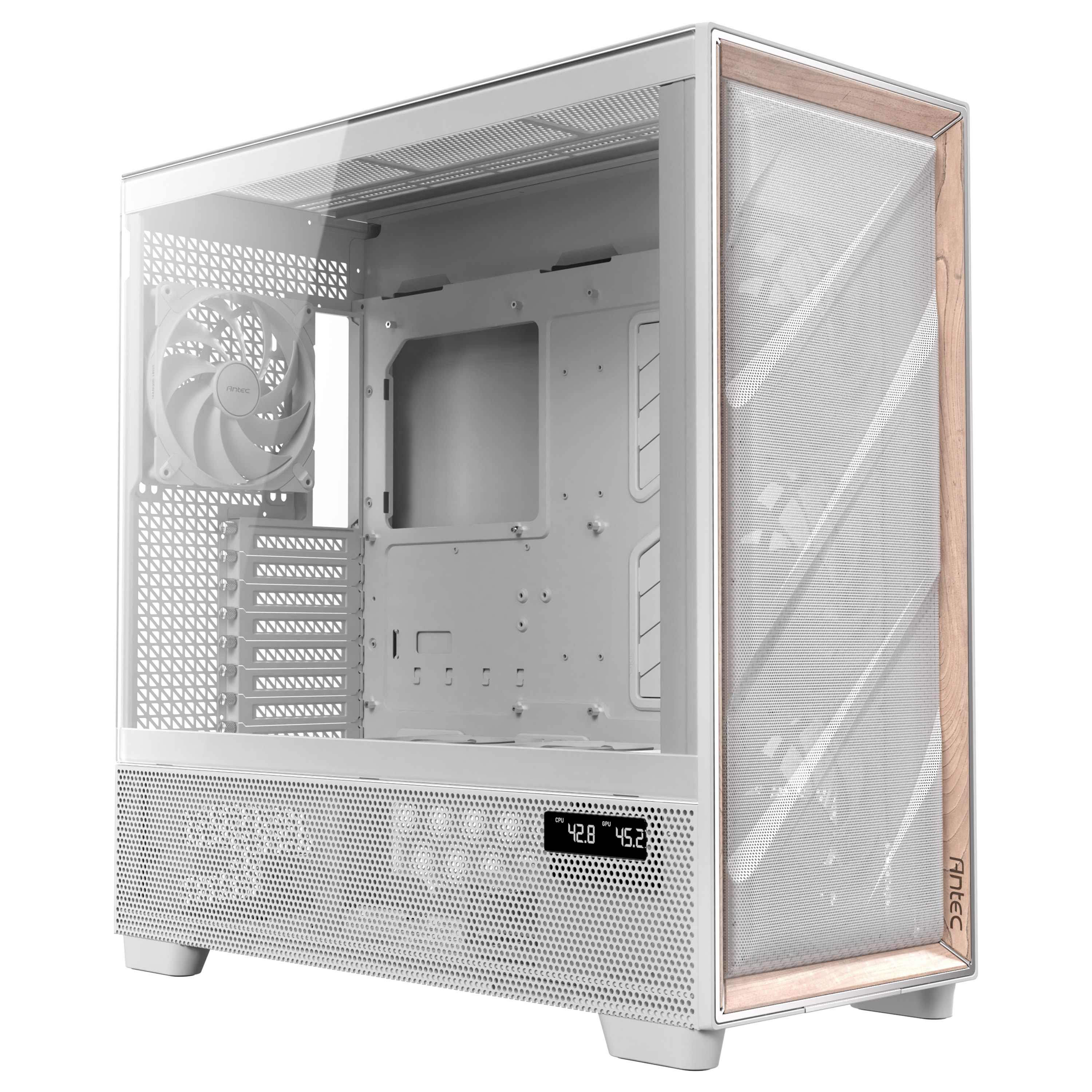 Antec Flux Pro is a full-size Full Tower case designed to provide efficient airflow and cooling. The enclosure combines sleek wood and metal mesh on the front panel, bringing a modern look to your home's interior. It supports a wide range of motherboards, including E-ATX, and provides ample space for cooling solutions and expansion.