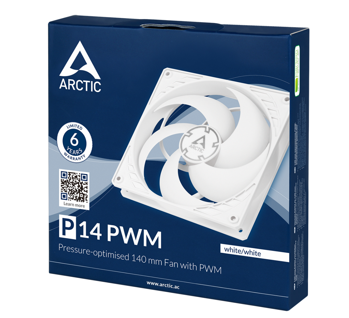 The ARCTIC P14 PWM (model ACFAN00222A) is a high-performance 140 mm fan optimized for high static pressure, making it an ideal choice for use on radiators and heat exchangers. With PWM Sharing Technology (PST), the fan can synchronize its speed with other fans in the system, providing efficient and quiet cooling. The fan blade design ensures a focused airflow, and the Fluid Dynamic Bearing guarantees a long service life and low noise levels. Key Features: Dimensions: 140 x 140 x 27 mm Rotation Speed: 200–1700 RPM (PWM controlled) Airflow: up to 72.8 CFM (123.76 m³/h) Static Pressure: 2.4 mm H₂O Noise Level: up to 22.5 dBA Bearing Type: Fluid Dynamic Bearing Connection: 4-pin PWM with additional 4-pin socket for PST Color: White