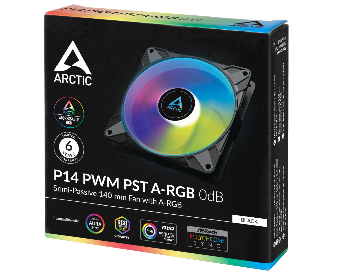 The ARCTIC P14 PWM PST A-RGB 0dB (model ACFAN00239A) is a high-performance 140 mm case fan designed for efficient cooling of your PC components. It features addressable RGB lighting, allowing you to customize your system's illumination to your preference. Key Features: Dimensions: 140 x 140 x 27 mm. Rotation Speed: 0–1900 RPM. Airflow: 68.9 CFM. Noise Level: up to 22.4 dB. Bearing Type: Fluid Dynamic Bearing (FDB). Connection: 4-pin PWM for the fan and 3-pin 5V for A-RGB lighting. Features: Support for 0dB technology for silent operation under low load, as well as PST (PWM Sharing Technology) for synchronizing the rotation speed of multiple fans.