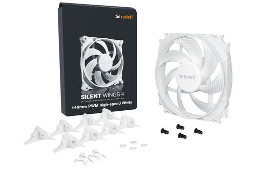 Silent Wings 4 140mm PWM high-speed White combines all features of a virtually inaudible with an extremely performant fan. A 6-pol-motor and anti-vibration mountings combined with fan blades optimized for maximum airflow make Silent Wings 4 140mm PWM high-speed White the perfect choice for the most demanding applications in high-end systems. be quiet! SILENT WINGS 4 | 140mm PWM high-speed White. Type: Fan, Fan diameter: 14 cm, Rotational speed (max): 1900 RPM, Airflow: 133.2 m³/h, Maximum air pressure: 2.36 mmH2O, Bearing type: Rifle bearing. Voltage: 5 - 13.2 V. Width: 140 mm, Depth: 140 mm, Height: 25 mm. Product colour: White