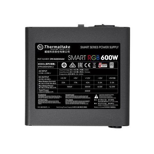 Smart RGB Series is the best idea for users to go with when they are looking for an RGB PSU which permits remarkable functionality and aesthetics in all cases, especially Open Frame or Tower cases.Thermaltake Smart RGB. Total power: 600 W, AC input voltage: 230 V, AC input frequency: 50 - 60 Hz. Motherboard power connector: 20+4 pin ATX, Motherboard power cable length: 50 cm, CPU power cable length: 55 cm. Purpose: PC, Power supply unit (PSU) form factor: ATX, 80 PLUS certification: 80 PLUS. Product colour: Black, Cooling type: Active, Fan diameter: 12 cm. Width: 150 mm, Depth: 140 mm, Height: 86 mm