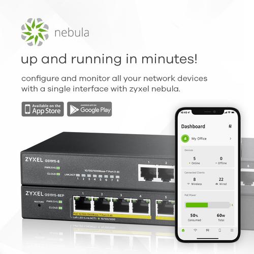 The Zyxel GS1915 Series offers two 8-port GbE Smart Managed Switches with and without PoE connectivity to small business network. The GS1915 Series supports NebulaFlex that comes with handy features and superior performance. This series is the most affordable hybrid switch solution for SB/SMB market. It can be easily setup through Nebula Control Center for cloud based unified management, or with its friendly Web GUI if you still prefer local setting.
