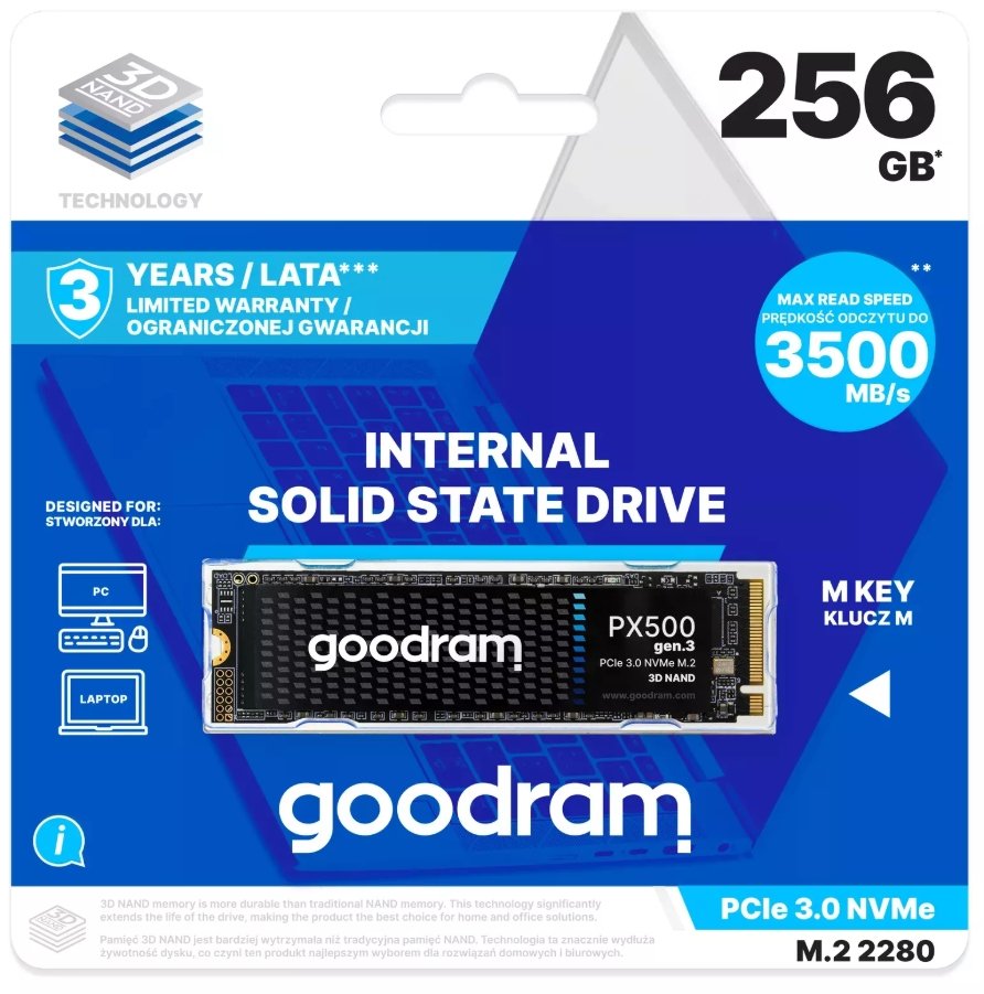 PX500 Gen. 3 - Ready for EverythingThe third generation PX500 NVME PCIE 3 X4 offers a significant improvement in computer speed, thanks to six times the speed compared to SSD III SSD. It is a great solution for constantly growing users who want to upgrade their devices at home or in the office. With a capacity of 256 GB, the PX500 Gen 3 is perfect for a wide range of applications, such as data storage, gaming, work and everyday use. Fast and roomyRead speeds of up to 3200 MB/s and write speeds of 1300 MB/s provide fast program loading and fast transfer, which guarantees the convenience of work at the highest level. Forget about the free loading of the application or the system startup. The disk capacity allows you to store - not huge data, including large files, multimedia, applications and even the operating system, without fear of running out of space on the mass storage. Leading technologyThanks to the PCIe 3 X4 interface, the Goodram PX500 Gen. 3 drive guarantees excellent capacity and efficiency even during intensive use, which is essential for applications that require high computing power and fast data access. The drive uses several technologies that not only improve IT efficiency, but also increase the durability and security of the stored data. Power without compromiseIf you are looking for a solution that can contain all your files, games, multimedia and applications in one place, then the 2-core SSD drive is the answer to your needs. Choose the reliability, performance and space you need and enjoy the smooth operation of your computer for many years.
