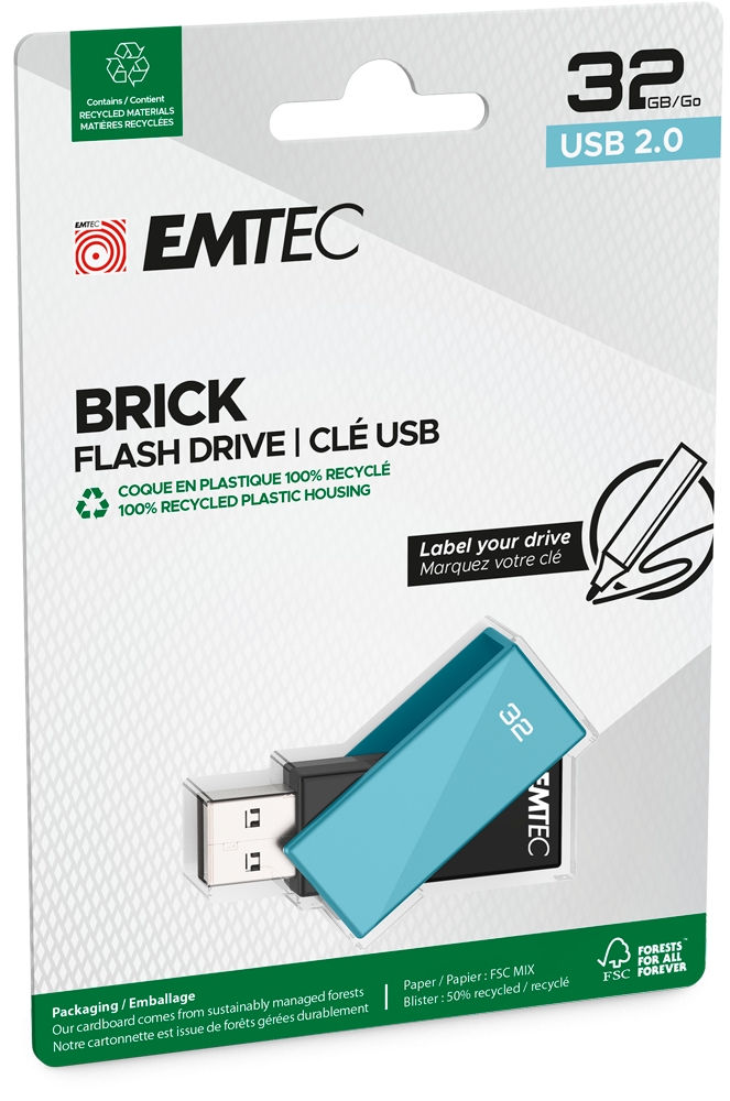 Matte finish. Exclusive Swivel ECO-DESIGN EMTEC 100% recycled plastic housing Colorful and sharp design, Keychain or lanyard hole Size : 58x17x10mm Available from 8 to 128GB