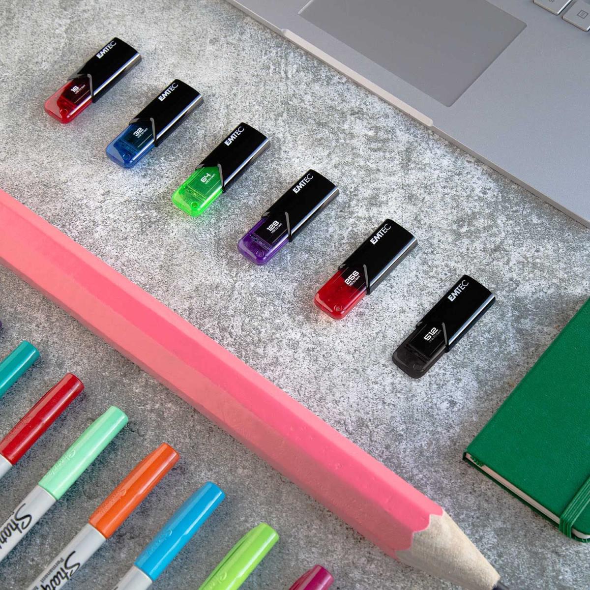 2x faster than USB 2.0 Exclusive capless EMTEC ECO-DESIGN 100% recycled plastic housing Mechanical slider with spring system A blend of black & color to add elegance without forgetting performance Hanging hole Capacities ranging from 16 to 512GB