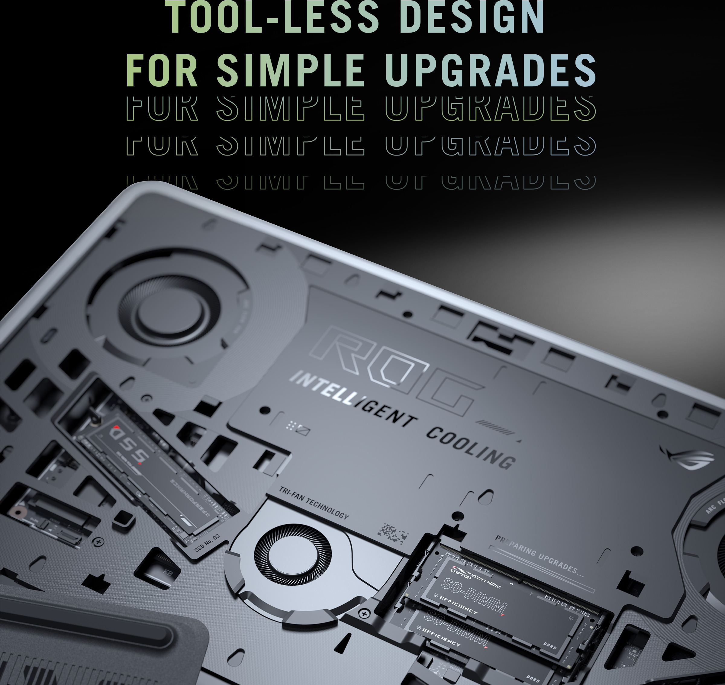 Asus has completely redesigned the 2025 Strix G18 to make upgrading even easier. The tool-less design allows easy access to both RAM, SSD drive and fans, and we've also brought in our latest Q-latch system for SSD slots. You can remove and replace the SSD and RAM in seconds. The specially designed bezel covers the rest of the motherboard to protect other components, but can be easily removed with a few screws for users who want to fiddle around more.