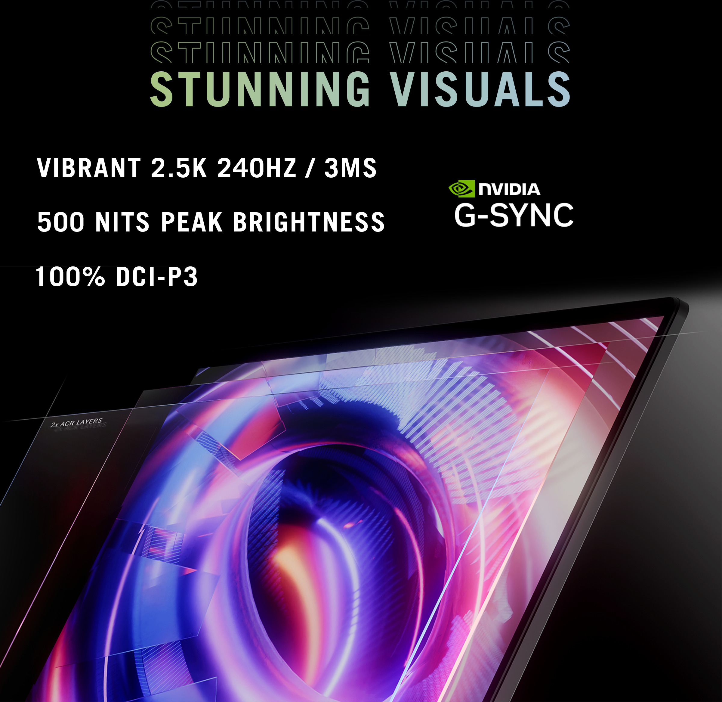 You can't beat the enemy if you don't see it coming. The Strix G18 features a super-fast 2.5K 240Hz Nebula display with a 3ms response time, ensuring you're always ahead of your opponent. The Strix G18 has a 16:10 panel with 500-nit brightness and 100% DCI-P3 overlay, so its colours are incredibly accurate and pixel-perfect even in the fiercest gunfights. We've also added a brand new ACR (Ambient Contrast Ratio) film with two layers that reduce glare and increase contrast for a more vivid visual image, as well as improving out-of-angle viewing where you might have onlookers.RTX™ 50 Series featuring NVIDIA Blackwell architectureNVIDIA Blackwell-powered GeForce RTX™ 50 Series graphics cards bring gaming revolutionary features to gamers and creatives. With massive AI power, the RTX 50 Series graphics cards bring new experiences and a new level of graphics. NVIDIA DLSS 4 multiplies performance and NVIDIA Studio unleashes your creativity so you can create images at unprecedented speeds.