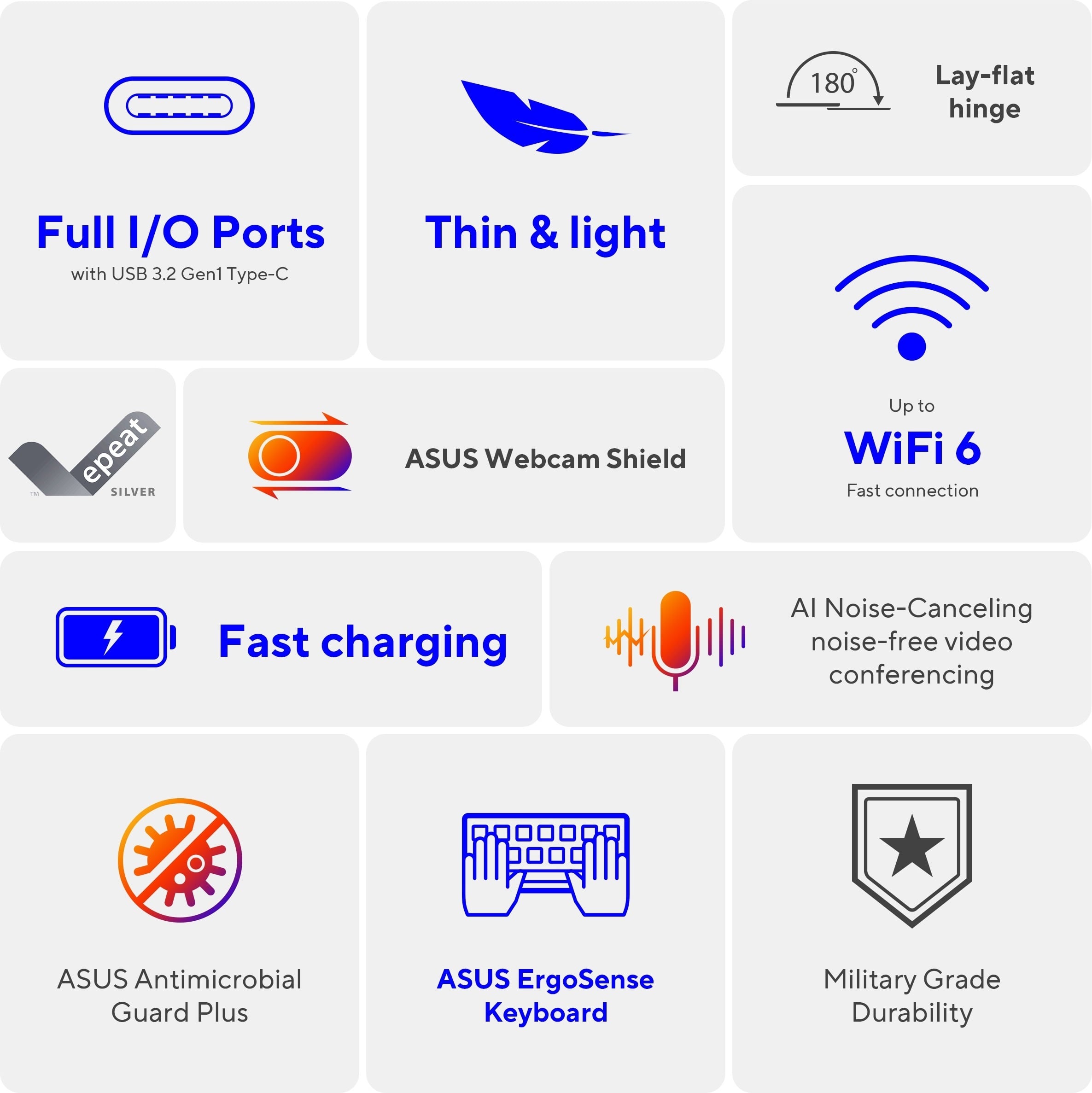 Asus Antimicrobial Guard Plus coating treats your notebook's most frequently touched surfaces to keep your device hygienic. This treatment is more comprehensive than ever before and is effective against viruses as well as bacteria. The treatment has been proven - in accordance with ISO 21702-11 and 2219612 standards - to reduce viruses and bacteria by 99% over a 24-hour period. The virus and bacteria strains used in the test were SARS-CoV-2 (COVID-19), H3N2 (influenza A) and E. coli.