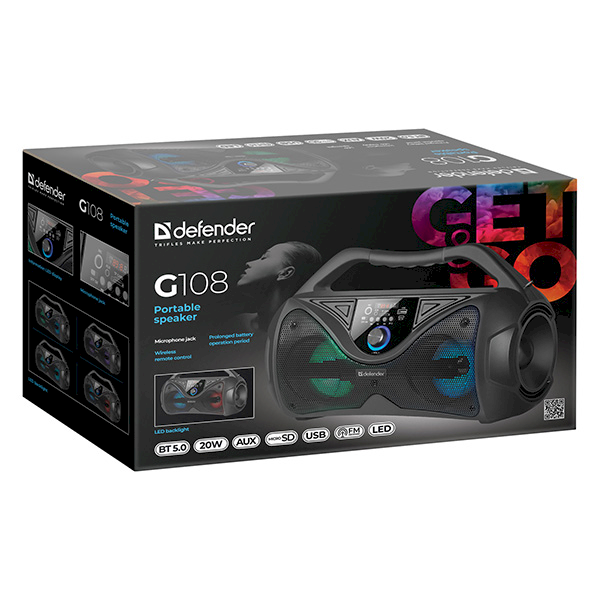 Defender G108 kaasaskantav kõlar | 20W | LED | Bluetooth 5.0 | kaugjuhtimispult | must (65108)