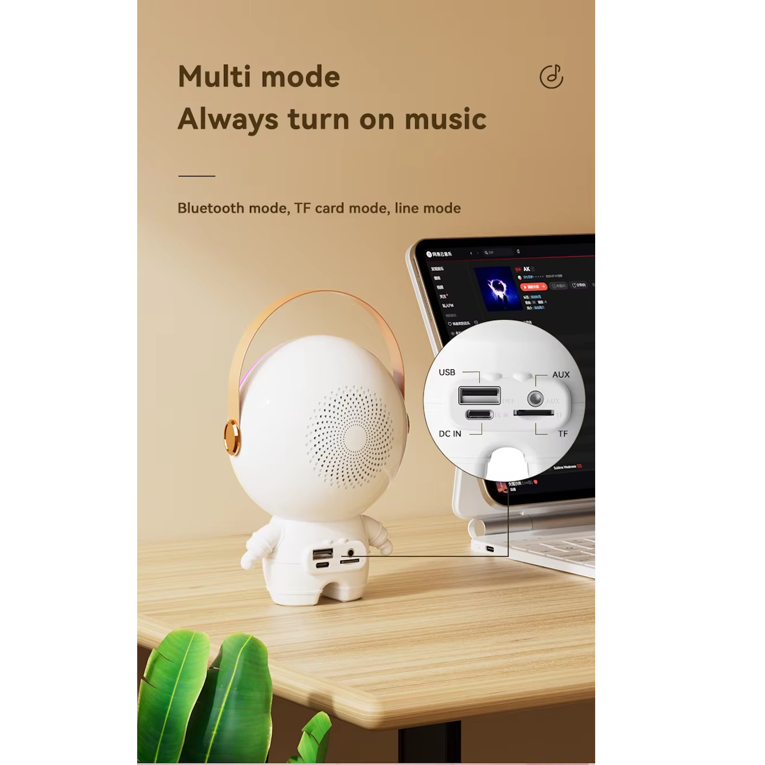 TK66 Astronaut Design Speaker with Dual MicDesign: Astronaut-inspired with lighting around the head1 Microphone: High-quality audio input for calls or recordingsFeatures: Built-in digital clock for added functionalitySound: Clear, powerful speaker outputLighting: LED lights for a dynamic lookIdeal for: Office, home, or gift useConnectivity: Bluetooth compatible