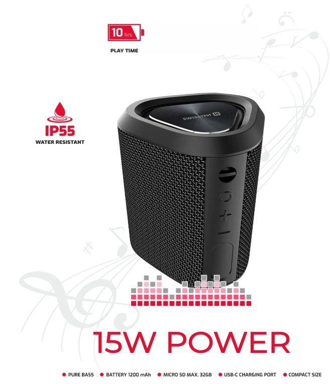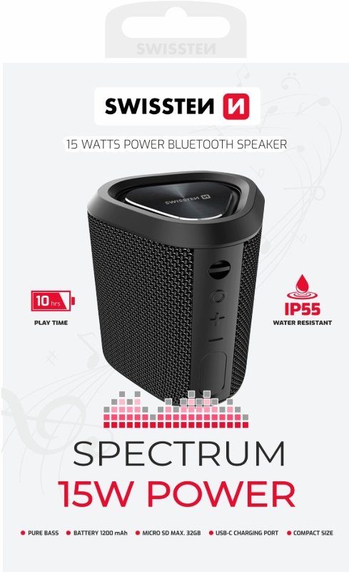 The SWISSTEN SPECTRUM is the perfect compact companion for your adventures. Its rugged, splash-resistant construction means you can take it party-to-party, from the pool to the campsite. Turn up the volume and experience your music like never before with room-filling sound that teaches your senses. Whether you're a music lover, outdoor enthusiast or just someone who loves great tunes, the SWISSTEN SPECTRUM will elevate your listening experience. Waterproof and dustproof IP55Thanks to the IP55 degree of protection, you no longer have to worry about your speaker falling into water at your party, camping or anywhere on the go. The speaker can also be used indoors, you can use it when showering, cooking or other activities that require water. The listening experienceDespite its small size, the speaker can create a musical experience that will make you feel like you're at a concert. This experience will be complemented by strong bass that will let you fully enjoy the music. Compact dimensionsYou will literally love the very small dimensions of the speaker (10.6 x 8.2 x 8.4 cm). It fits in all backpacks, purses and bags, ensuring that you always have it at hand. TWS functionIf you want to expand your listening experience, the SWISSTEN SPECTRUM speakers can be easily connected using the TWS function. Pairing two speakers takes a short while, which expands the power of one speaker to two. Long playing time of up to 10 hoursThe battery capacity of 1200 mAh requires a long endurance of 10 hours at 50% volume. SpecificationsDimensions: 106 x 82 x 84 mmBluetooth version: 5.0Frequency: 80 Hz - 15 kHzBluetooth range: < 10 metersPower: 15WPlay time: 10 hours (50% volume)Speaker: 52 mmImpedance: 40Charging port: USB-CCharging time: 2.5 hoursInput: 5V DC 1A / 5WBattery capacity: 1200 mAhBattery type: Li-ionResistant: IP55 The package includes a USB-A - USB-C cable, 50cm, 2A.
