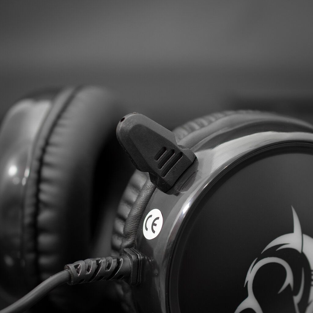 Volume control: Back left side of the headphones Mic: Integrated USB Hub Mute button Microphone sensitivity: -32dB +/- 3dB Mic impedance: 2.2 kOm Orientation: Omnidirectional Mic dimension: 4mm x 1,5mm Sensitivity: 62dB +/- 3dB Impedance: 32 Ohm Frequency range: 20Hz - 20kHz Speaker size: 50mm Type: Over head Interface: 2 x 3,5mm (Audio IN/OUT) + USB 2.0 (LED illumination) Lighting: YES / LED 7 colors Braided cable Cable length: around 2m Material: Plastic / Metal Color: Black