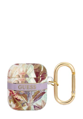 GUESS - The case protects the docking station for wireless Apple AirPods headphones from surface damage and possible loss. The high-quality case perfectly matches the original AirPods case and feels extremely comfortable. There is a practical gold ring on the side of the case, which you can use to attach the case to a leash, for example. Collection: Flower Strap Colour: Purple Compatible with: Apple Airpods 1, Airpods 2 Officially licensed quality product from GUESS.