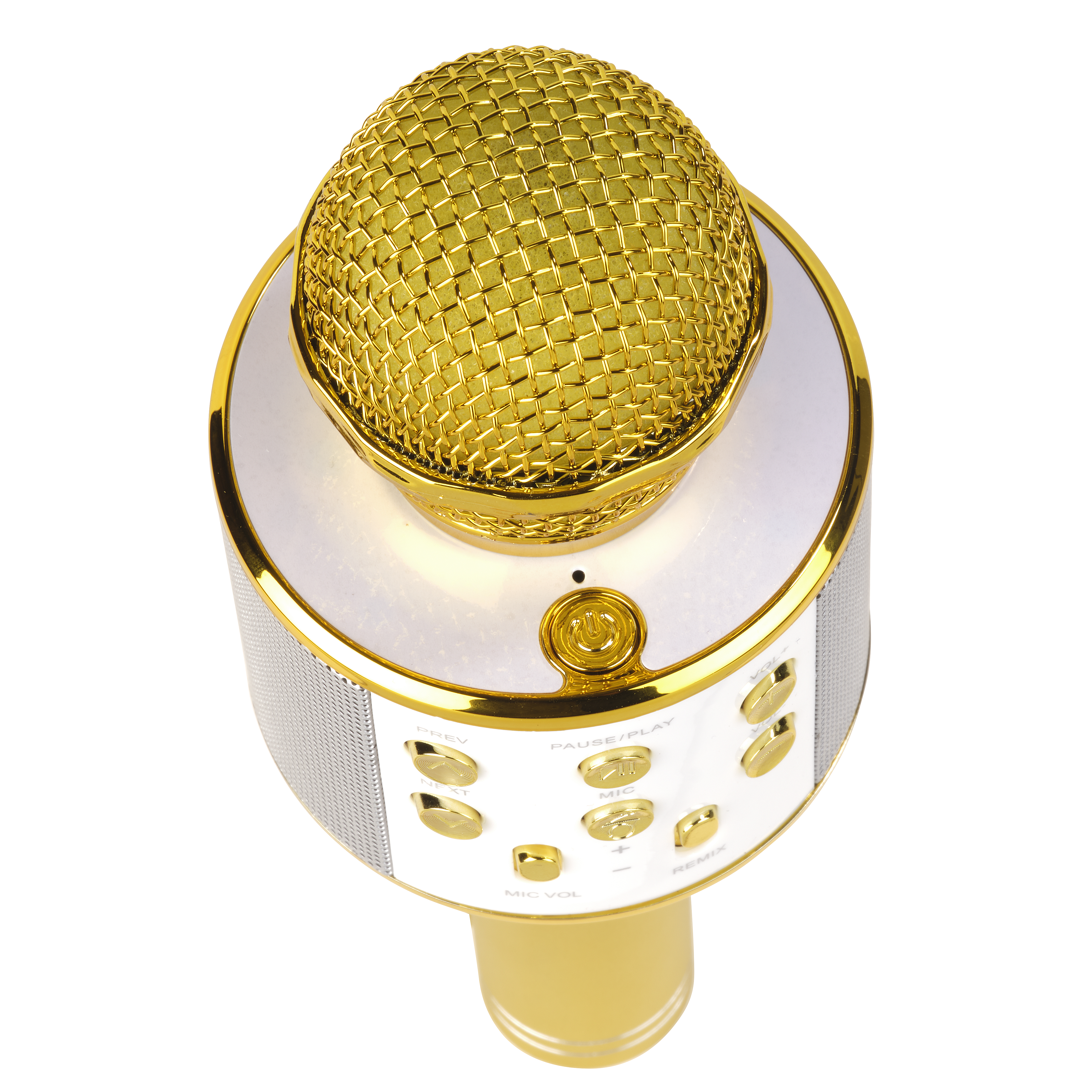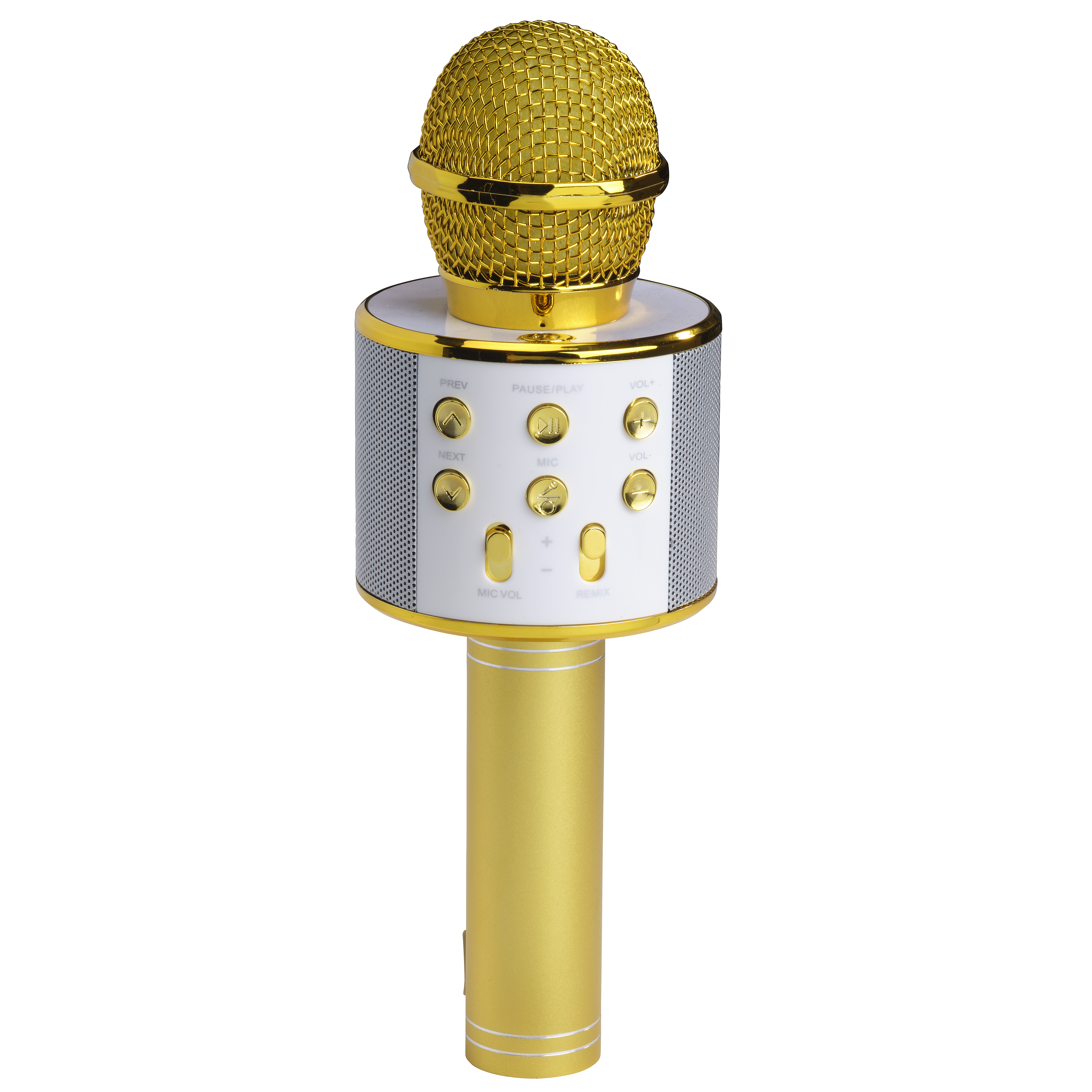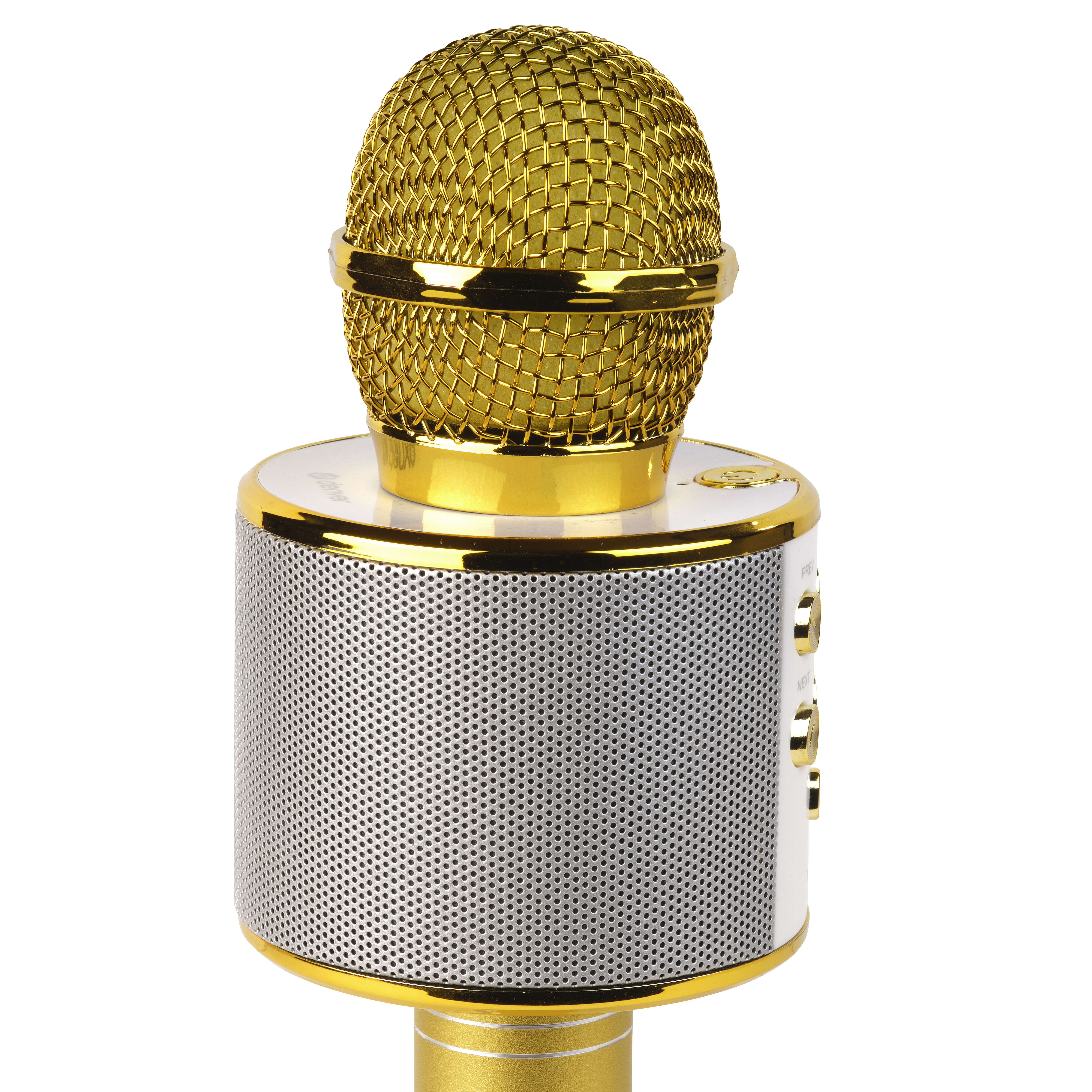 Wireless Bluetooth karaoke microphone speaker Use your phone via Bluetooth, and you have an all in one karaoke machine USB/SD card slot for MP3 playback Easy to use, just connect your smart phone and play Operating range: 8 - 10 meters AUX input Volume output: 5W RMS Built-in 1200mAh lithium battery with 5 - 6 hours playtime Inputs: USB & SD card slot for MP3 playback, AUX input for MP3 players, PC’s etc. Size (cm): 7.5 (w) x 7.5 (d) x 23 (h)