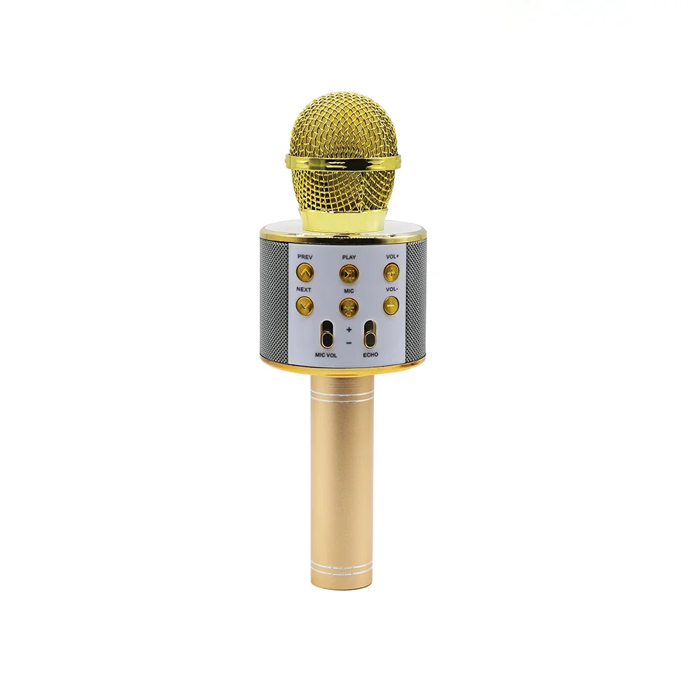 Karaoke microphone with speaker MIC10-G Revolutionary technology allows you to listen to music and sing using only one device. The presented karaoke microphone with a loudspeaker with 5W output power emits clear, loud sound with high quality. Equipped with Bluetooth 5.0 technology, it also ensures smooth communication with smartphones, tablets and many other wireless devices. Advanced voice modulation and echo functions will guarantee even more great fun with your loved ones. Features Bluetooth karaoke Built-in battery Voice modulation Playing music Echo Technical data Output power: 5W(RMS) Playback: MP3 Bluetooth: 5.0 Sockets: micro SD, AUX-in, Line, USB Compatibility: Android and IOS Power supply: 5V DC, Built-in battery Dimensions: 7.5 x 7.5 x 22 cm Weight: 240 gr Set contains: Microphone (gold color) USB charging cable User manual