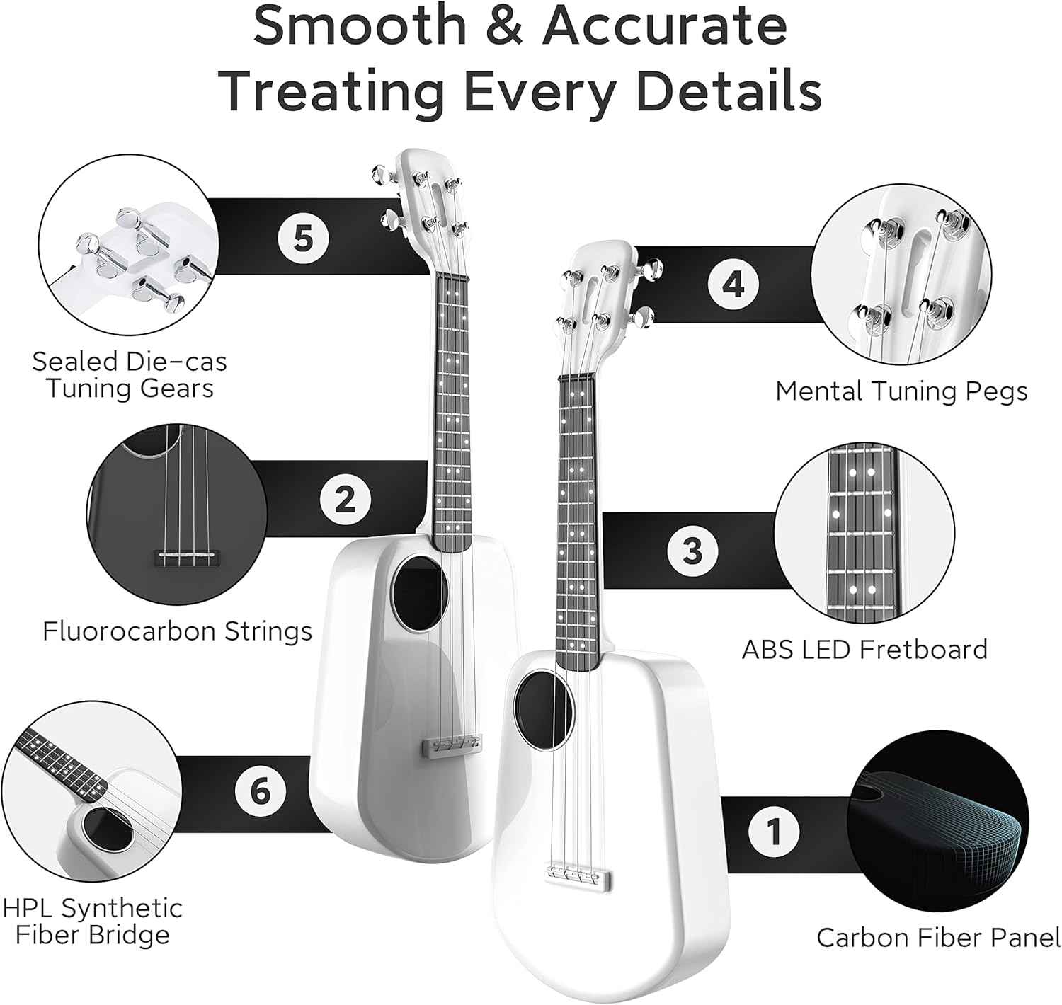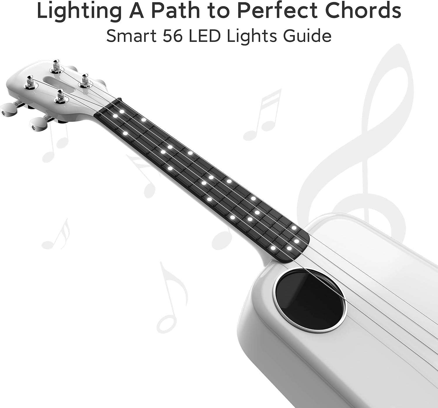 Model: Populele 2 Type: Soprano smart ukulele Color: Pink Body Material: Solid wood (usually maple or mahogany) for quality sound and durability Size: Standard soprano size (about 54 cm length) Connectivity: Bluetooth 4.0 low energy for seamless mobile device pairing Features: Interactive learning through mobile app with sheet music and video tutorials LED fretboard lights to help beginners position fingers correctly Built-in sensors track playing accuracy and send feedback to the app Ability to record and analyze playing Compatible with iOS and Android Battery: Built-in lithium-ion battery with 3-5 hours of playtime per charge Charging: Via USB Type-C Weight: About 500 grams, making it lightweight and portable Package includes: Ukulele, USB charging cable, user manual Additional features: Built-in learning modes for fun and effective practice App supports sound tuning and various playing modes Perfect for beginners and children Package dimensions: Length: approx. 0.60 m Height: approx. 0.20 m Width: approx. 0.15 m