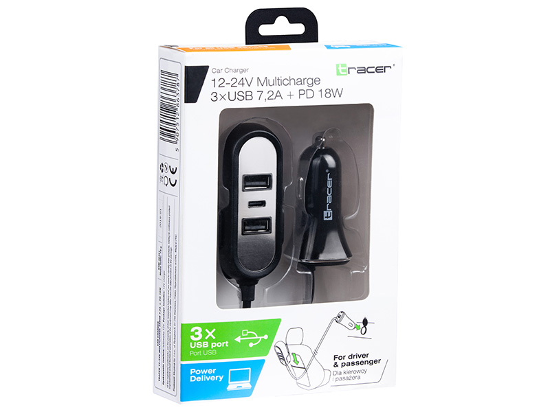 TRACER 12-24V MULTICHARGE 3xUSB 7.2A + PD 18W autolaadija loodi nii juhile kui ka reisijatele. Sellel on kokku 3 USB-porti mobiilseadmete või navigeerimise laadimiseks, samuti USB-C-port PD 18W funktsiooniga, mis võimaldab laadida valitud uusimaid tehnoloogiaid toetavaid MacBooke ja netbooke. See on väike ja stiilse välimusega seade, mis on kasulik igal reisil. Kokku toetab see kuni 7,2 A.