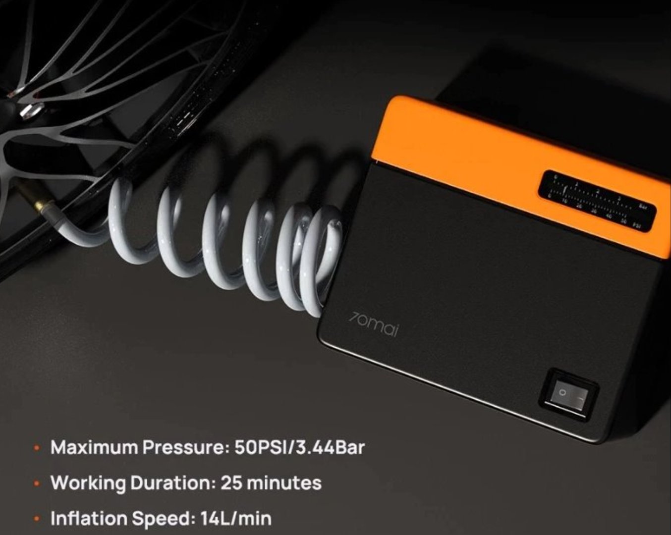70mai brings a new portable compressor with dimensions similar to the iPhone X.Small but powerful, this is exactly what compresses this compressor.The compressor has a built-in lamp, it is equipped with a built-in hose (1 m) with an end piece for common valves on a car, motorcycle, bicycle but also a scooter.The package also includes a needle for inflating soccer balls and also a round tip for inflating the mattress.The compressor is also equipped with a mechanical pressure gauge.Power is sufficient to inflate up to 3.4BAR, 50PSI or 3.4ATMThe power supply is solved via an adapter to the car lighter with a length of 3.3 m. This way you can comfortably inflate all four wheels on your car.The connection to a car lighter may seem restrictive, but the opposite is true.According to the law of approval, the compressor would be discharged if you needed it and you had to wait so long for the battery to charge.This way, it is ready for full performance as soon as it is needed.Properties- 12V power supply from the car lighter- max current 6A- manual pressure gauge with an accuracy of + -3PSI- max compressor capacity 14L / min- length of inflatable hose 1m- power cable length 3.3m- built-in flashlight- needle for inflating balls- adapter for inflating mattresses- dimensions 15 x 12cm