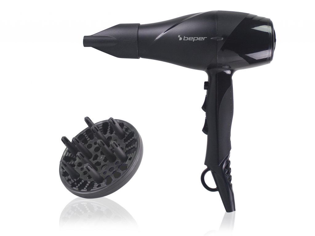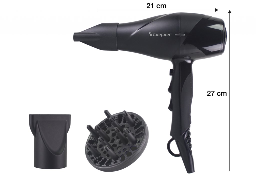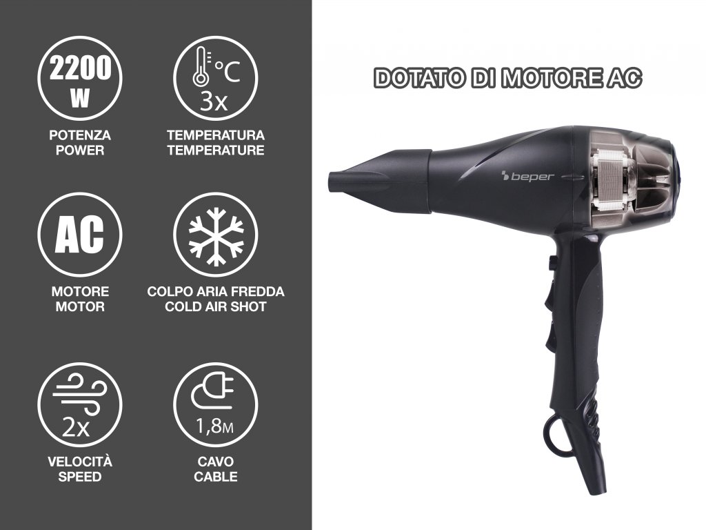 Hair dryer with professional 2200W AC motor. Two speeds and three selectable temperatures guarantee maximum user comfort. The cold air button allows the hairstyle to be fixed. Complete with styling concentrator for perfect styling and diffuser to give volume from the roots. Removable air filter for easy cleaning and hook for hanging.