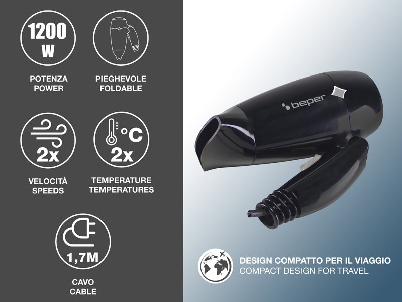 Compact hair dryer ideal for travel, thanks to its foldable handle that allows for space-saving transport. Two selectable speed and temperature settings. Air concentrator for styling (included). 1.7m long power cable.