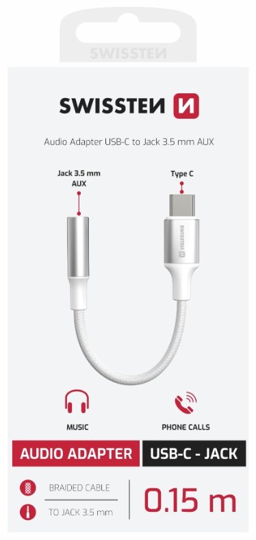 The audio adapter SWISSTEN Textile USB-C / 3.5mm AUX 15cm is an ideal solution for users of modern devices without a traditional audio jack. This high-quality adapter allows you to easily connect headphones or speakers with a 3.5 mm jack to a device with a USB-C connector. Thanks to the textile braiding, the cable is resistant to wear and tear, which guarantees a long service life and reliable sound transmission. The 15 cm length is practical for use on the go and at home without adding unnecessary cable lengths. AdvantagesCompatible with a wide range of USB-C devices.The durable textile surface ensures a long service life.Compact length ideal for mobile use.Reliable sound transmission without interference.Adapter works for call transfer.