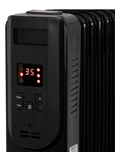 LED Oil-filled Radiator with remote controlLarge and legible LED displayHeating power settings: 600W/900W/1500WTemperature control: 15°C - 35°CAutomatic selection of power consumption according to the set heating temperatureTimer: 12hRemote control: 2xAAA not includedNumber of ribs: 7Rib dimensions: 120x550mmSound signal when the device mode is changedHousing: solidWheels: to protect against scratching the floor when movingCable storage:Power cord length: 1.48mColor of housing: blackRaw material of housing: iron 0.5mmOverheat protection:Safety switch: on the side of the devicePower supply: 220-240V ~50/60HzPower: 1500WProduct dimensions with assembled wheels: 33*24*59,5cm