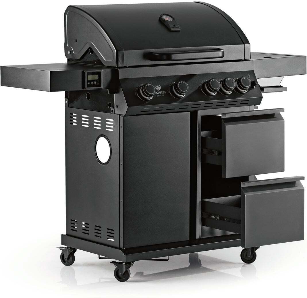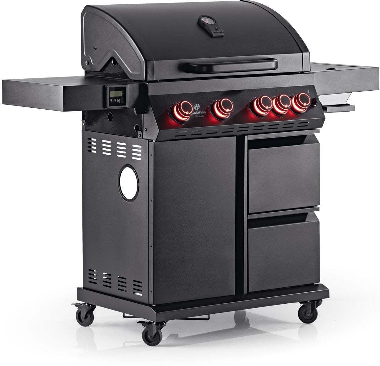 A stunning matt black gas grill with four burners, an infrared side oven reaching up to 800°C, a digital baking thermometer for correct grilling results and drawers with one double-walled warming box with GN container and lid. The GN container is perfect for keeping fresh drinks and grilled products. The red LED lights on the controls glow brilliantly as the evening darkens.