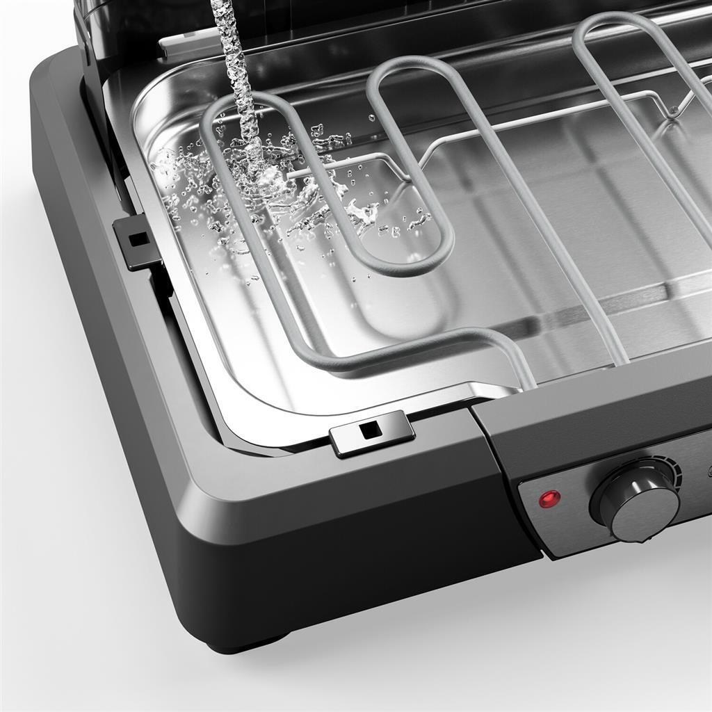The grill's two grids offer plenty of space (43 x 27 cm) for cooking, making it perfect for families and evenings out with friends. The non-stick coating reduces the build-up of grease and food residue, and makes cleaning easier. The Princess electric barbecue has a grease tray that you fill with water before you start grilling, ensuring that there's little chance of smoke build-up. Grilling liquids and fats fall into the water bath and cool immediately, so there's no unhealthy smoke or ash particles on your food. An electric barbecue produces less smoke, making it versatile for a variety of situations.