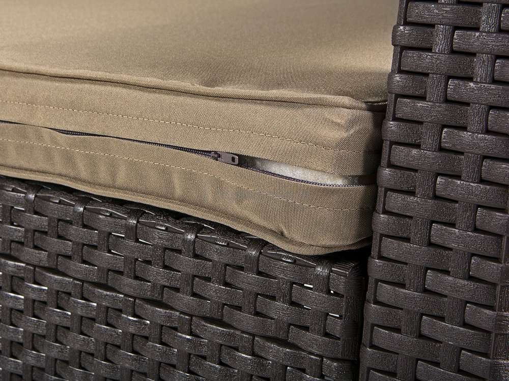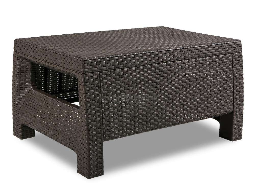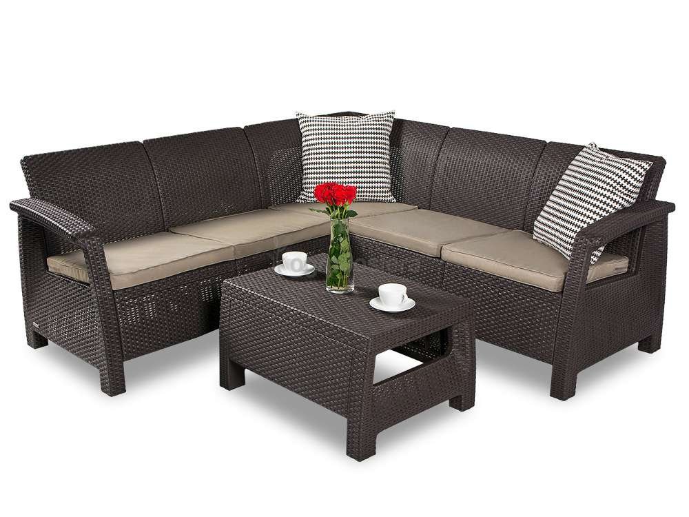 Corner garden furniture set with table Rattan-look plastic material Includes sofa and table Sofa dimensions: 1900 × 1900 × 790 mm Table dimensions: 770 × 570 × 420 mm Weight: 38.42 kg