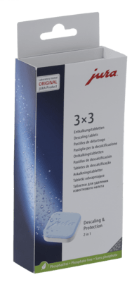 2-faasilised katlakivieemaldustabletid Täisautomaatsete kohvimasinate eluea pikendamiseks on JURA välja töötanud 2-faasilise katlakivieemaldustableti, mis eemaldab õrnalt katlakivi ja samal ajal kaitseb täisautomaatset masinat. Spetsiaalselt JURA täisautomaatsete kohvimasinate jaoks välja töötatud optimeeritud lahustumisajaga katlakivieemaldustablett eemaldab katlakivi puhtalt, tõhusalt ja eriti säästvalt.