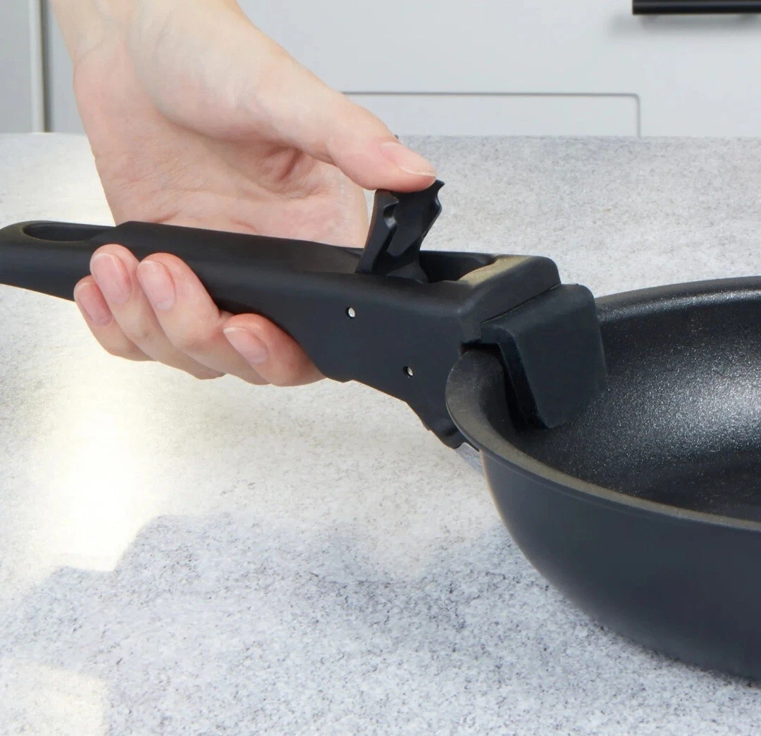 Set: 20, 24, 28cm frypan; 16, 18, 20cm saucepan; 2 detachable bakelite handles; 3pc utensils; 3 glass lids Size: l20 x w20 x h4.5, l24 x w24 x h5, l28 x w28 x h5.5 cm Size: l16 x w16 x h8cm, l18 x w18 x h8.5, l20 x w20 x h9 cm Material: Pressed aluminium; body thickness: 2.5mm Int. Coating: Black megastone non-stick. Ext black matte PAI Handle: Detachable bakelite; Base: induction Logo: SLTR logo centre base; Dishwasher safe: No Utensils set; Slotted spatula; Slotted spoon; Solid spoon Material: SS430 head with black megastone coating Handle: PP with TPR.