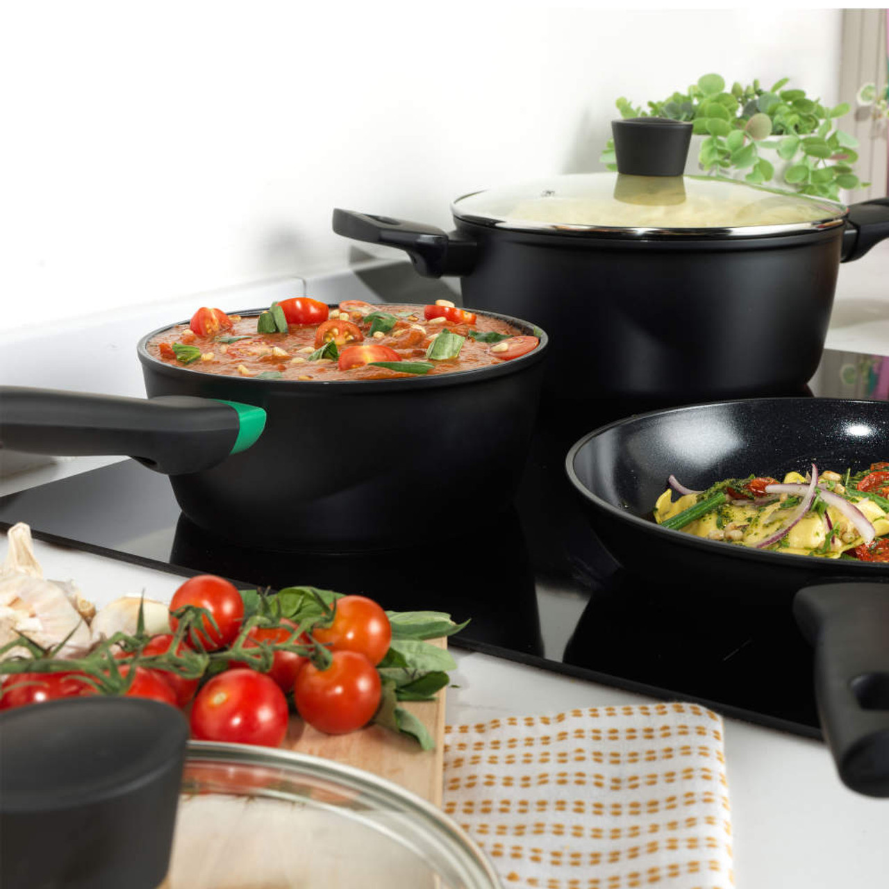 This Russell Hobbs Verde Thermocollar 20 cm Saucepan is crafted from recycled forged aluminium, ideal for environmentally conscious homes. With intelligent heat indicator technology,the collar turns green when the optimum cooking temperature is reached for better results. For toxin-free cooking, this pan has a healthy ceramic non-stick coating that is PFAS-free and does not contain lead or cadmium. Perfect for any kitchen, this cooking pot can be used on all hob types, including induction, and is incredibly easy to clean after use. Finished with a soft-touch handle that stays cool during use for added comfort and safety, this innovative cookware is essential for every home.